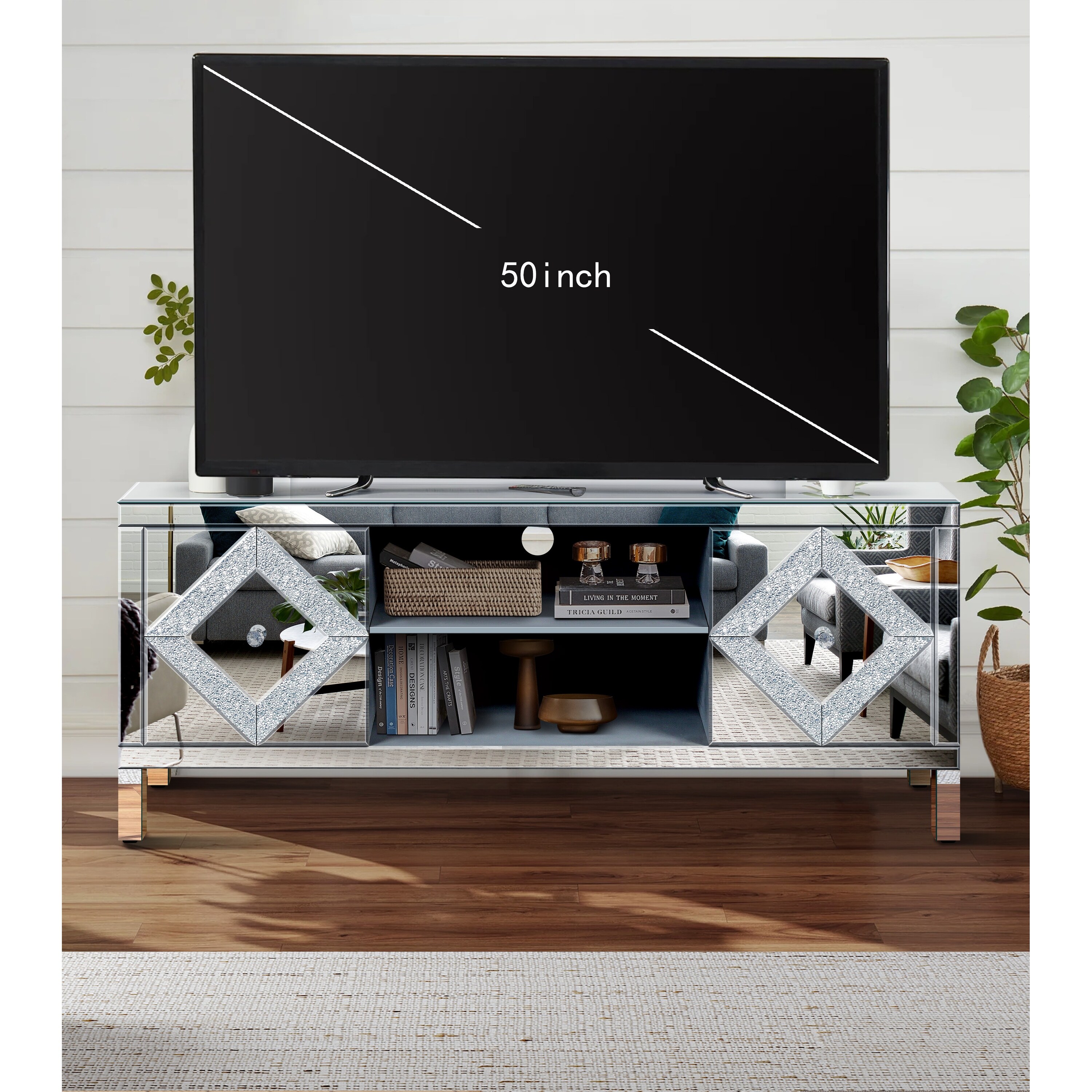 47 Inch Mirror TV Media Console with Diamond Glass Doors, Dual Door Design with Open Storage Space, Compatible with 50-Inch TVs