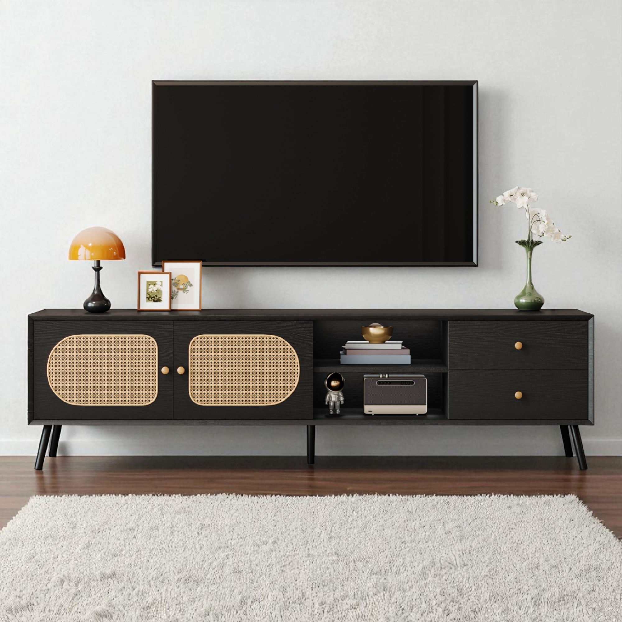 70" Rattan TV Stand for TVs up to 80", Mid-Century Entertainment Console with 2 Drawers & Open Shelf for Living Room