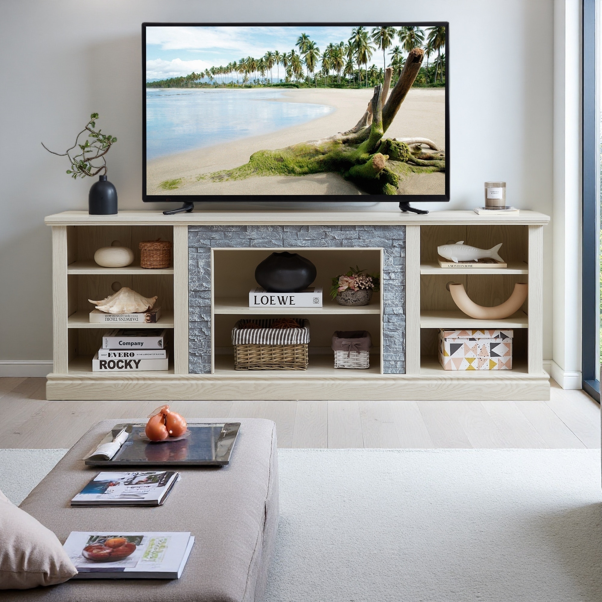 70" Large Modern TV Stand with Faux Stacked Stone & Storage Cabinet