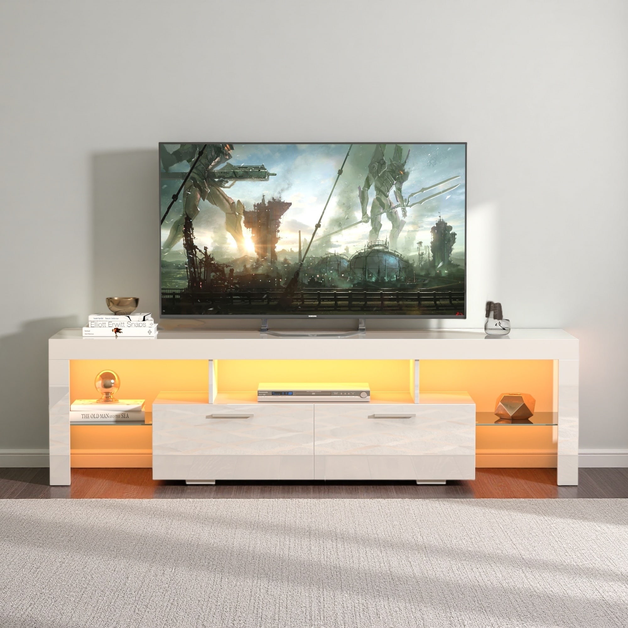 68.9" Modern TV Stand with 4 Glass-Front Drawers - Built-in Charging Station, Ambient LED Lighting