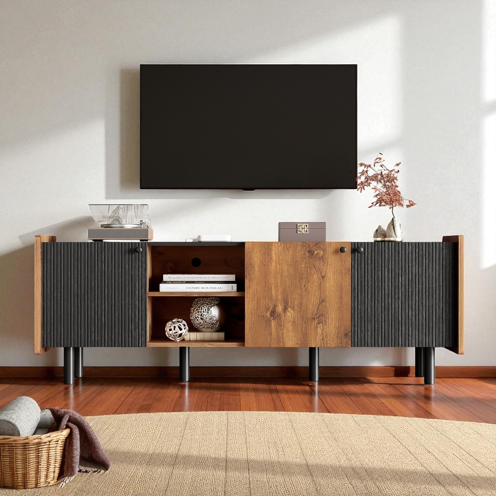 Mid Century Modern TV Stand for 70 Inch TVs, Entertainment Center with 3 Cabinets, 2 Open Shelves and Storage Console