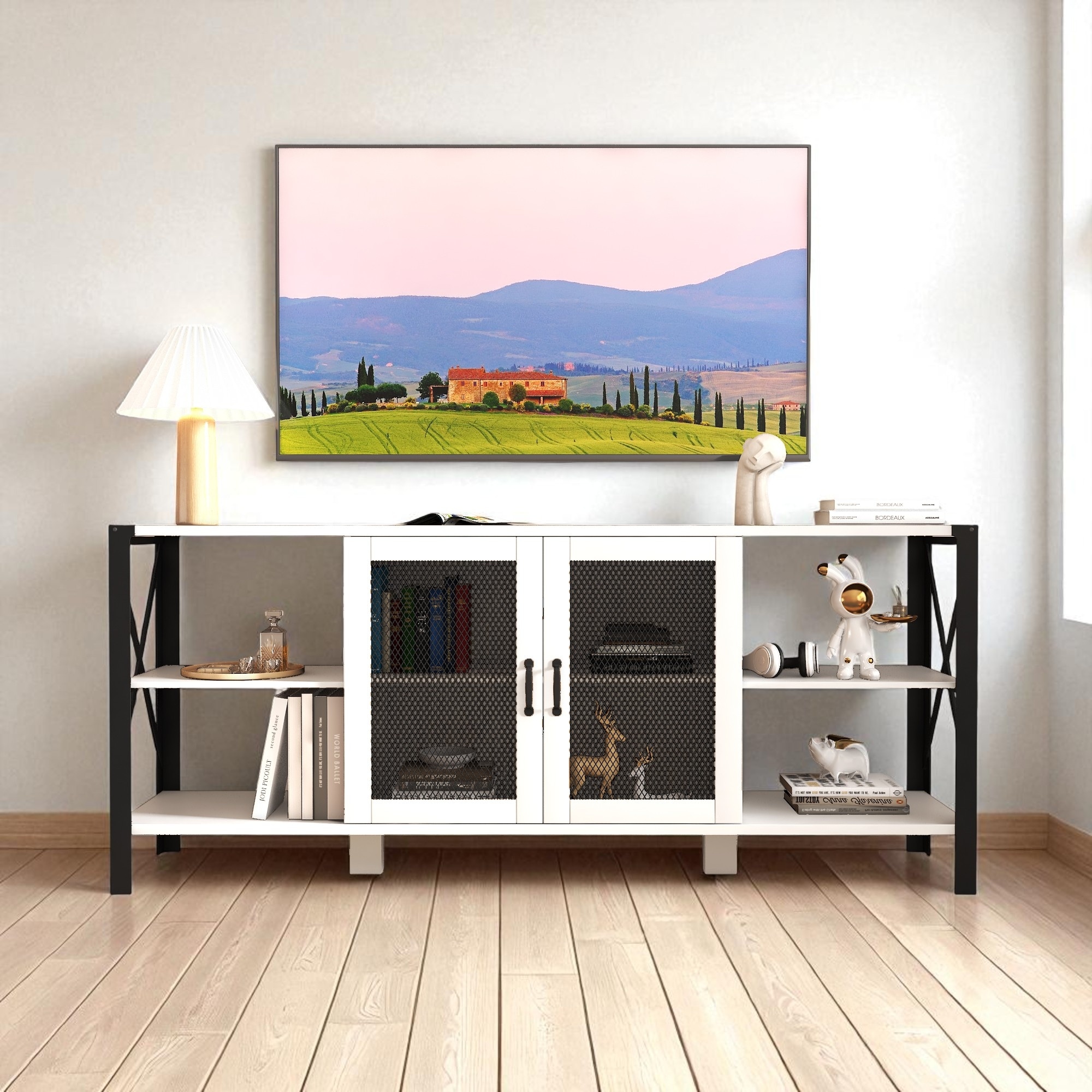 80 Inch TV Stand with Mesh Door and Open Shelves, Modern Wood and Metal Entertainment Center for Living Room or Bedroom