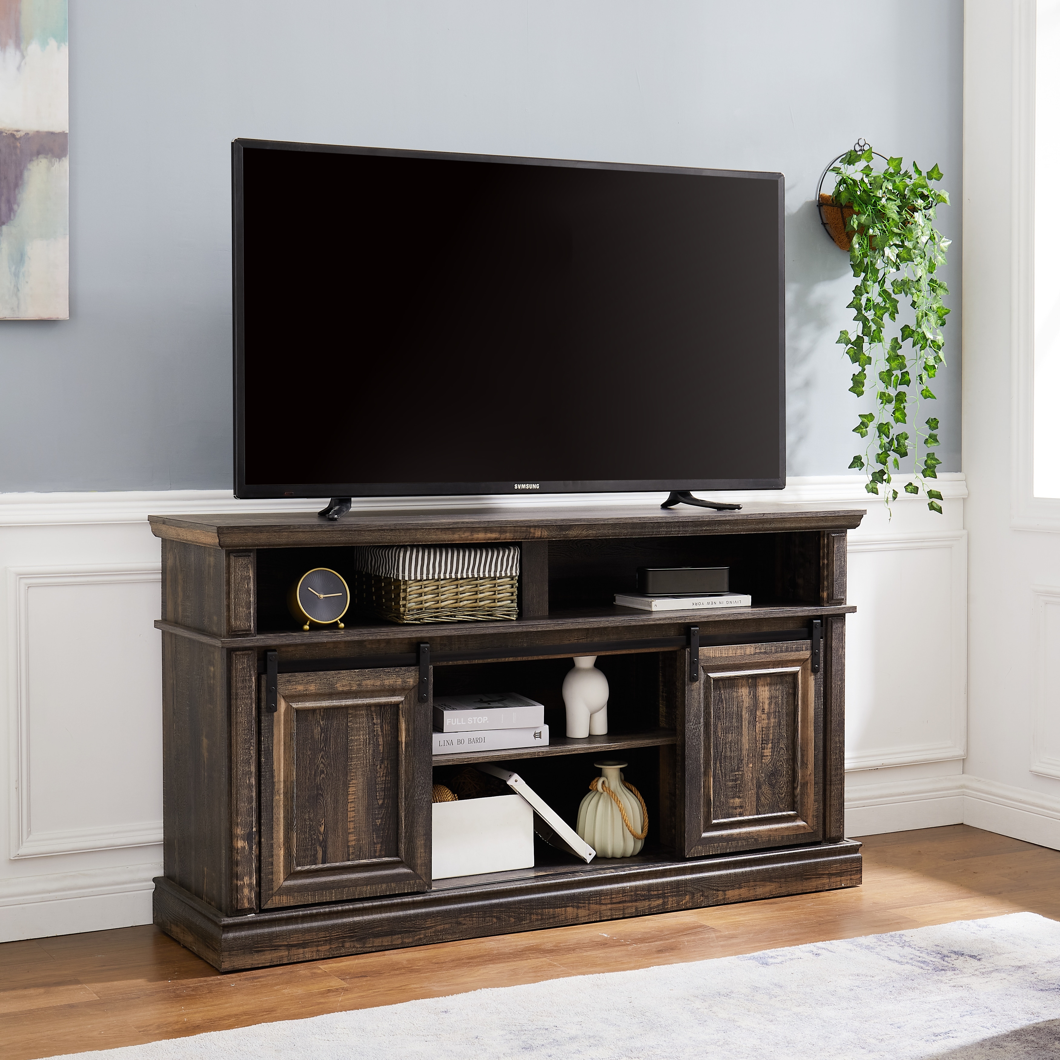 Classic Gray Wash TV Stand with Cable Management and Storage for 65-Inch TVs.