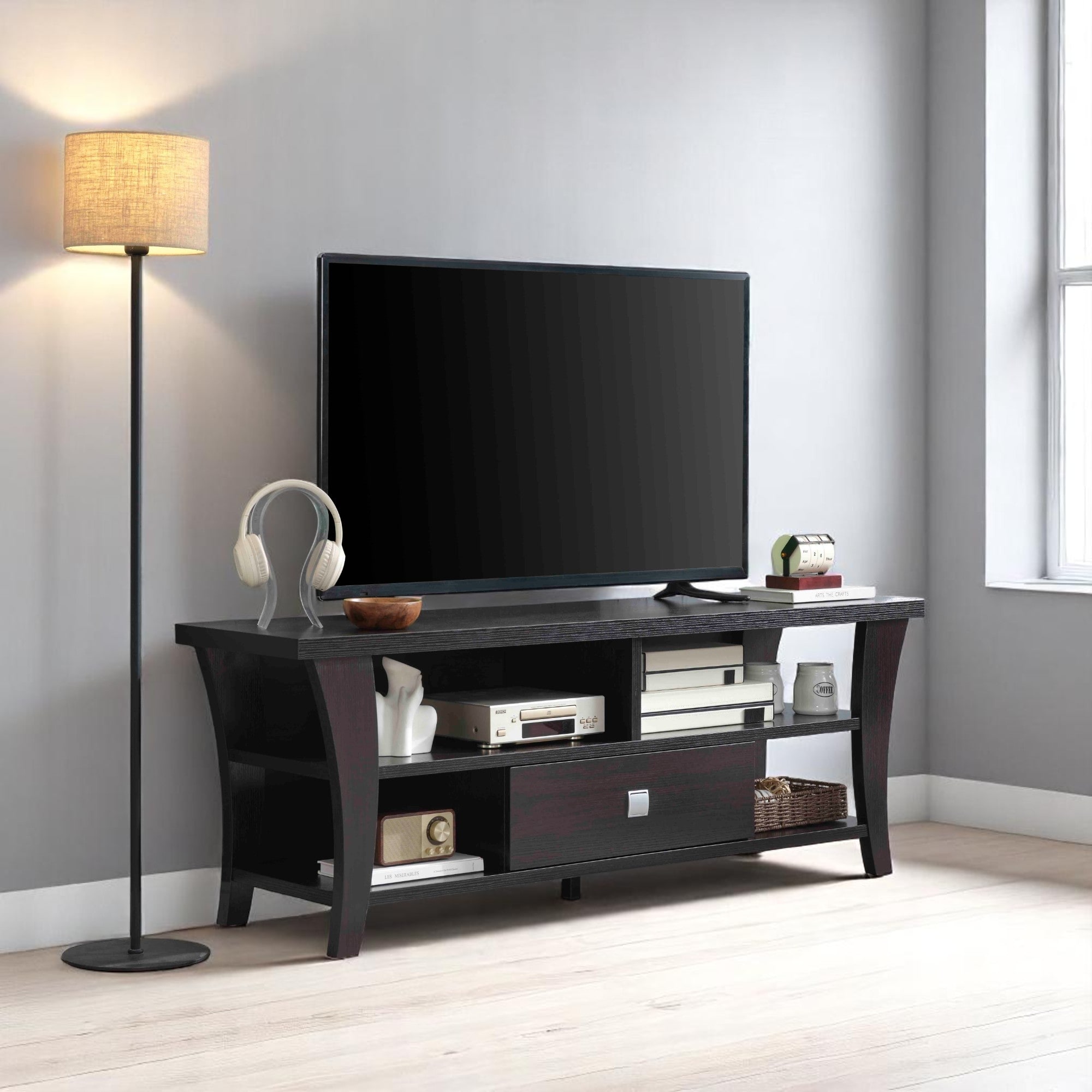 Modern TV Stand with Drawer and Divided Shelf, Espresso Media Console with Curved Legs, Metal Handle, Fits TV up to 65"