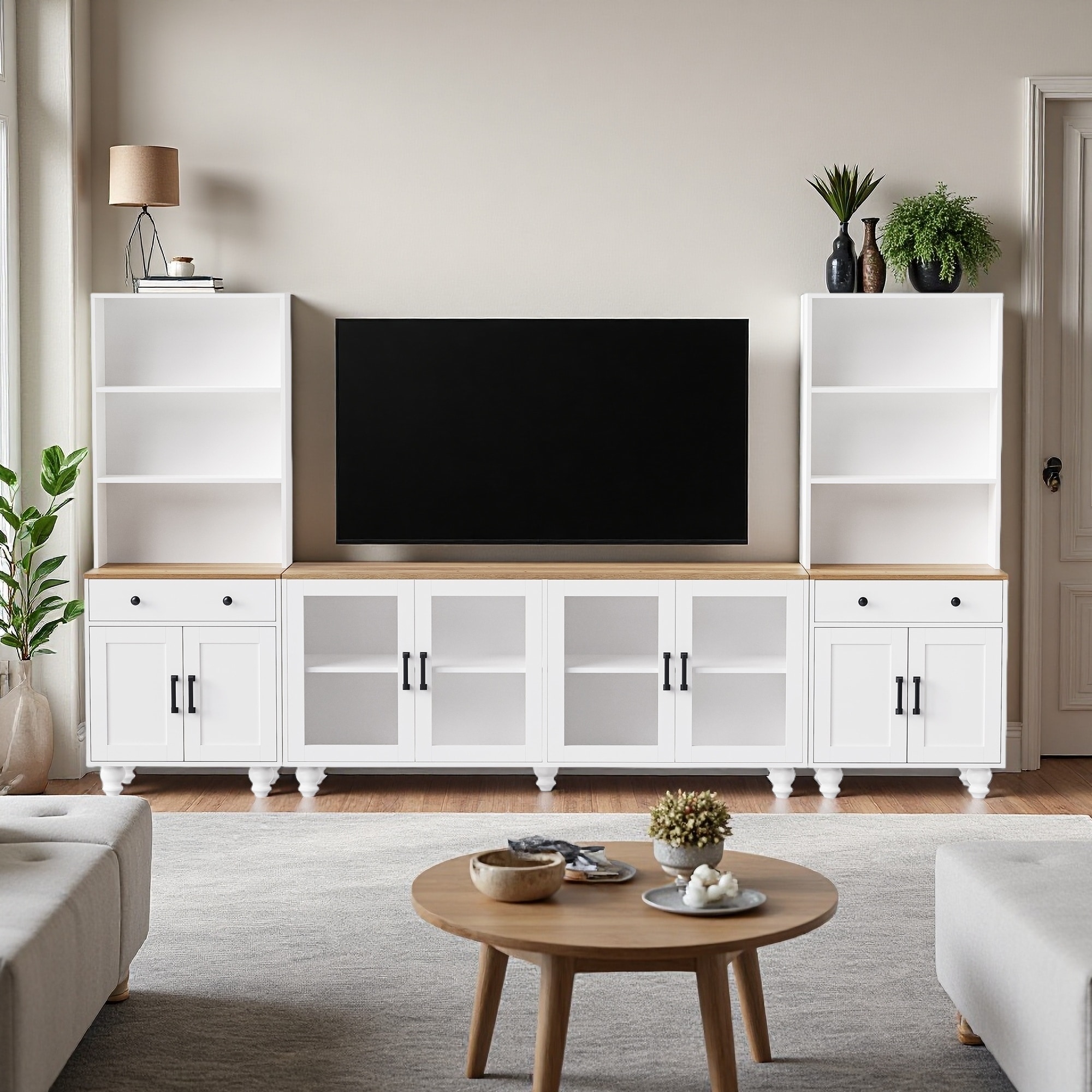 110" TV Stand with Tempered Glass Doors, Adjustable Shelves & Tall Bookshelves