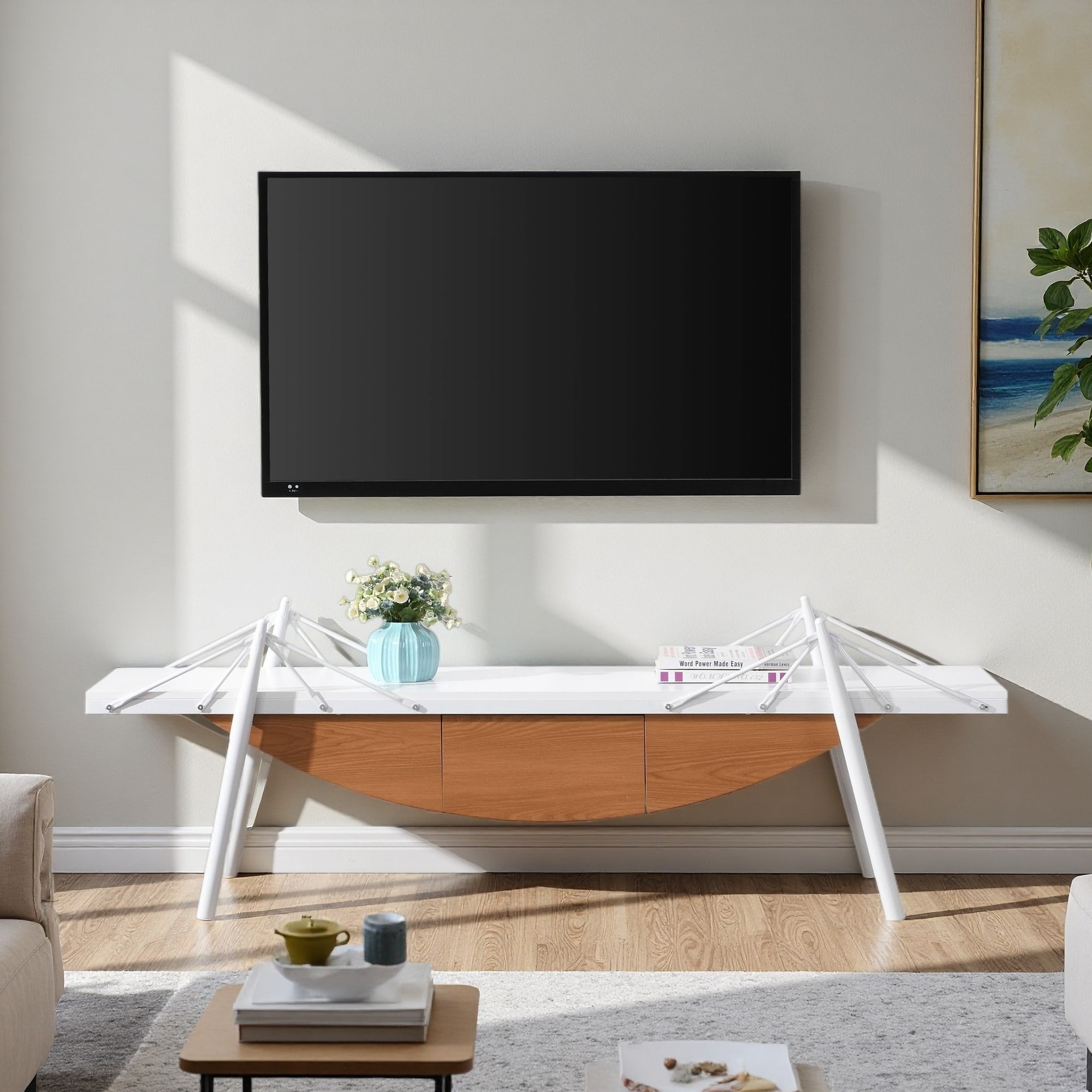70.9" Modern TV Stand with Drawer and Sailboat-Inspired Display Shelf, Sea-Crossing Bridge Shaped Media Console Table
