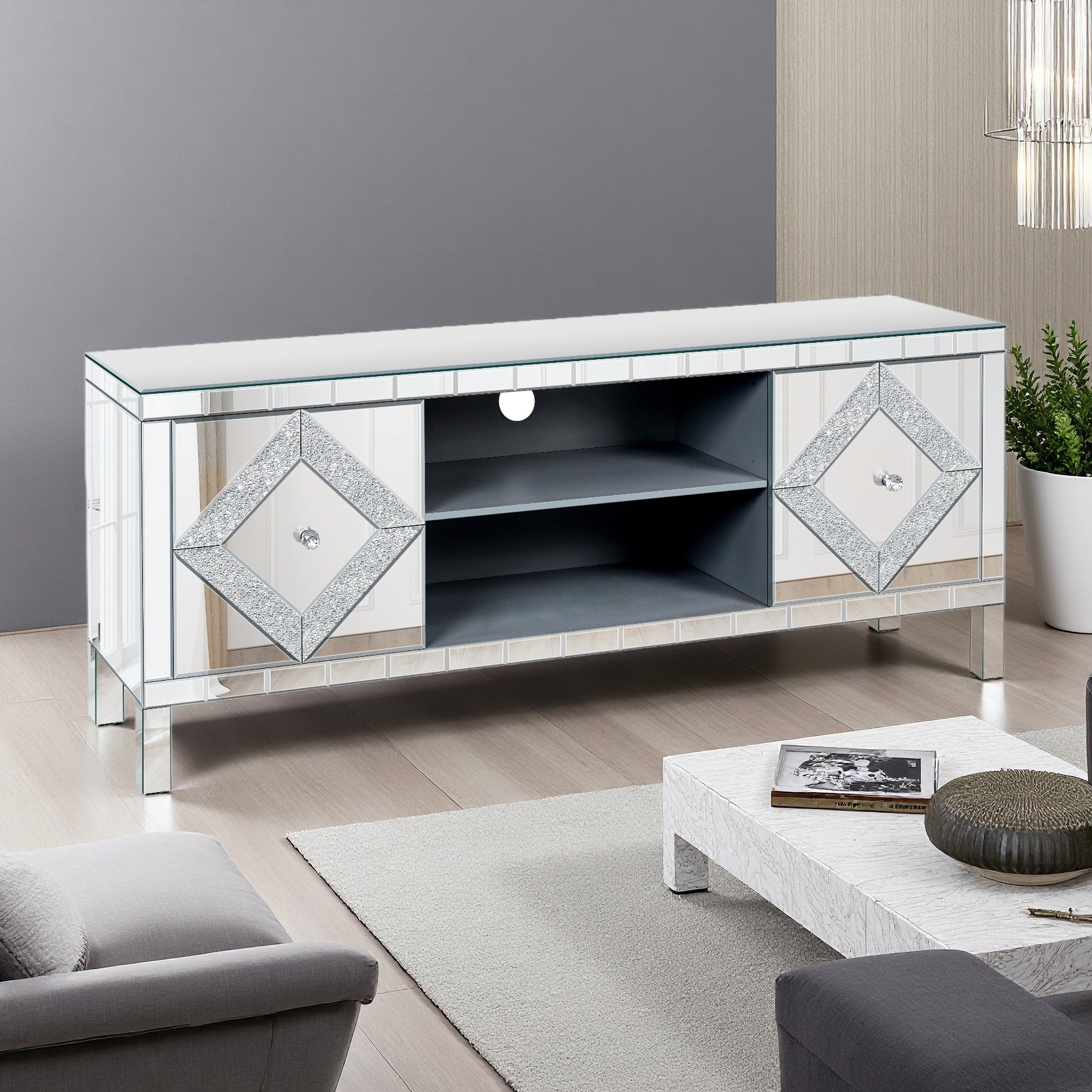 60" Mirrored TV Stand for 65+ Inch TVs, Modern Console Table with Open Storage and 2 Cabinets, Diamond Pattern Glass Doors