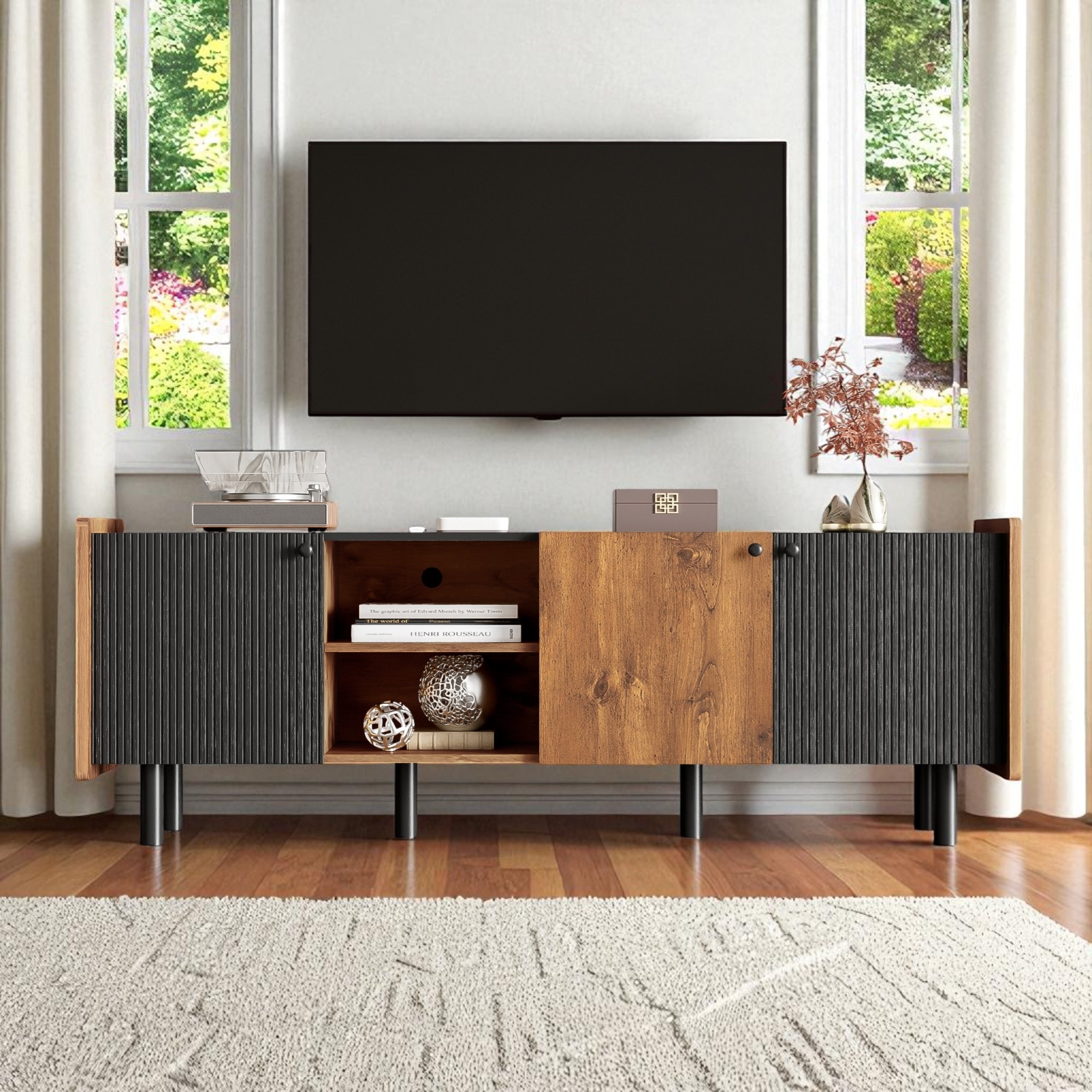 Mid-Century TV Stand with 3 Cabinets & Open Storage, Entertainment Console for TVs up to 70", Black Handle & Top Panel