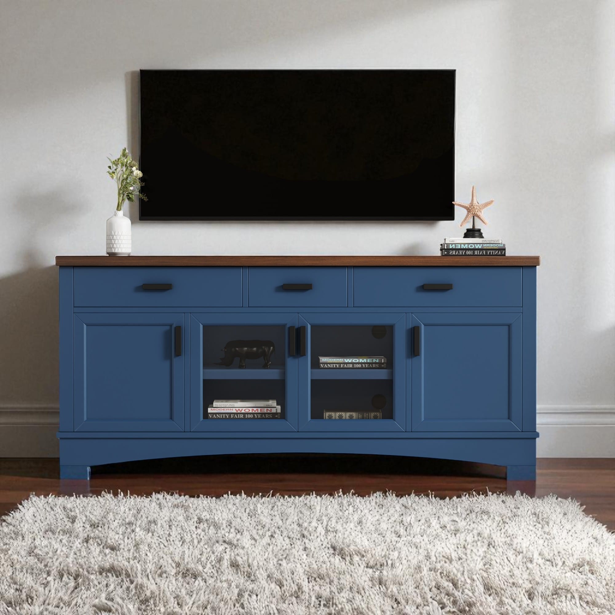 Modern 67" TV Stand with Glass Doors, Storage Drawers and Adjustable Shelves, Media Console with Cable Management
