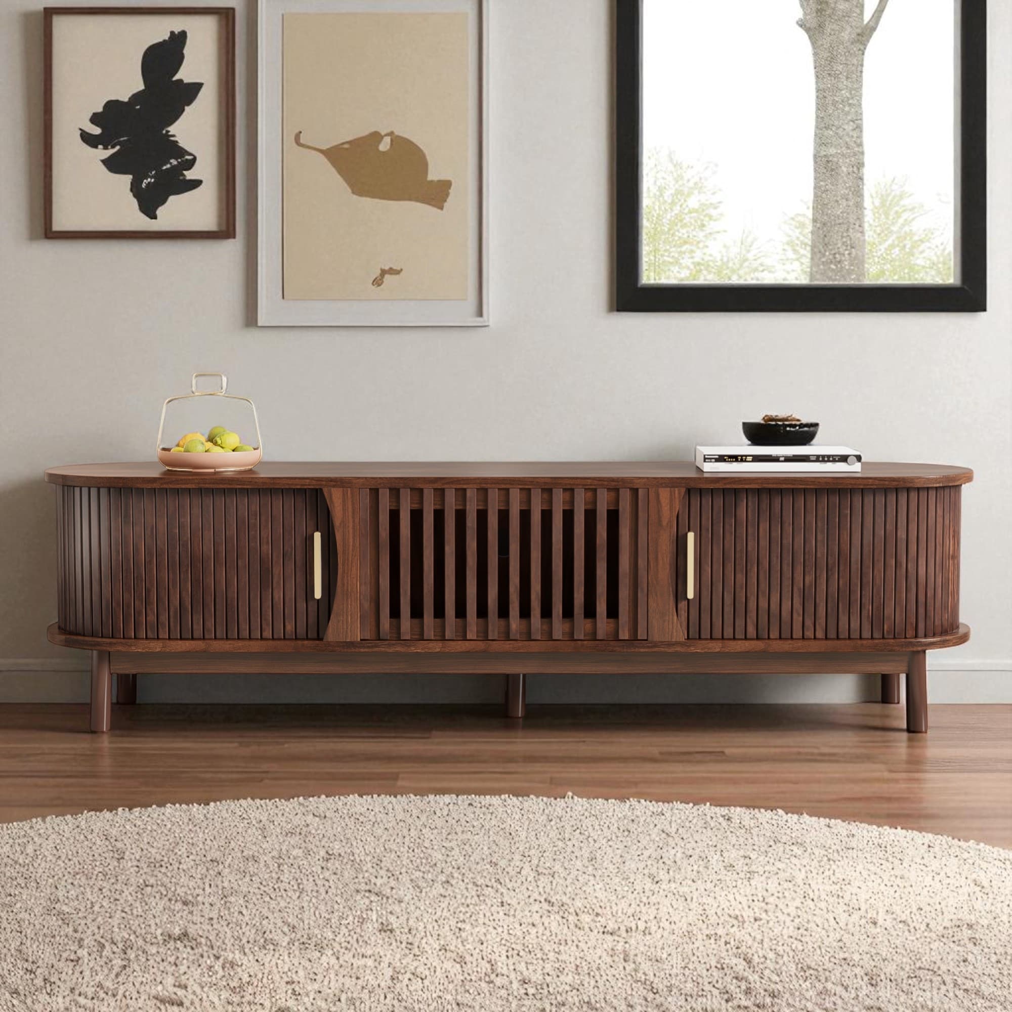 Multipurpose TV Stand, Console Table with 2 Sliding Fluted Glass Tempered Doors, Entertainment Center with Open Shelves