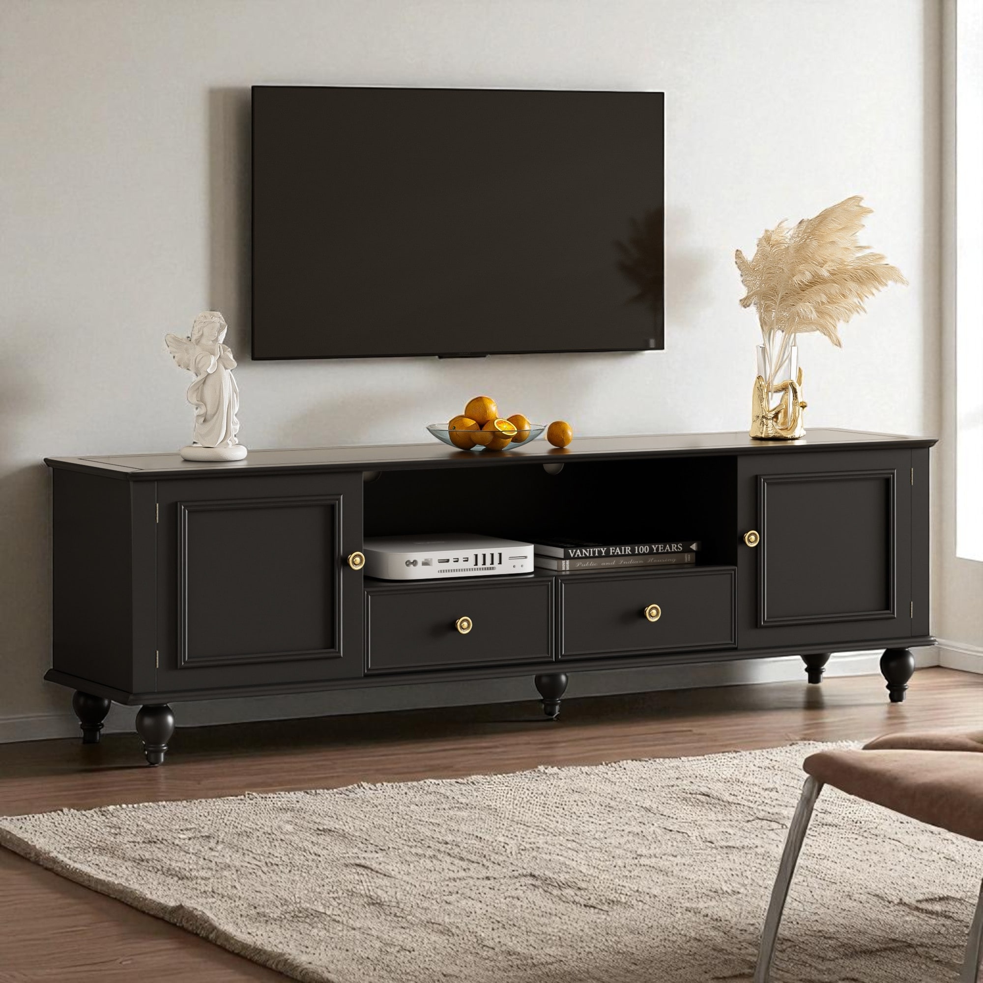 70.9'' Modern TV Stand for TVs up to 80", Entertainment Center with Cabinets, Drawers, Open Compartment and Solid Wood Legs