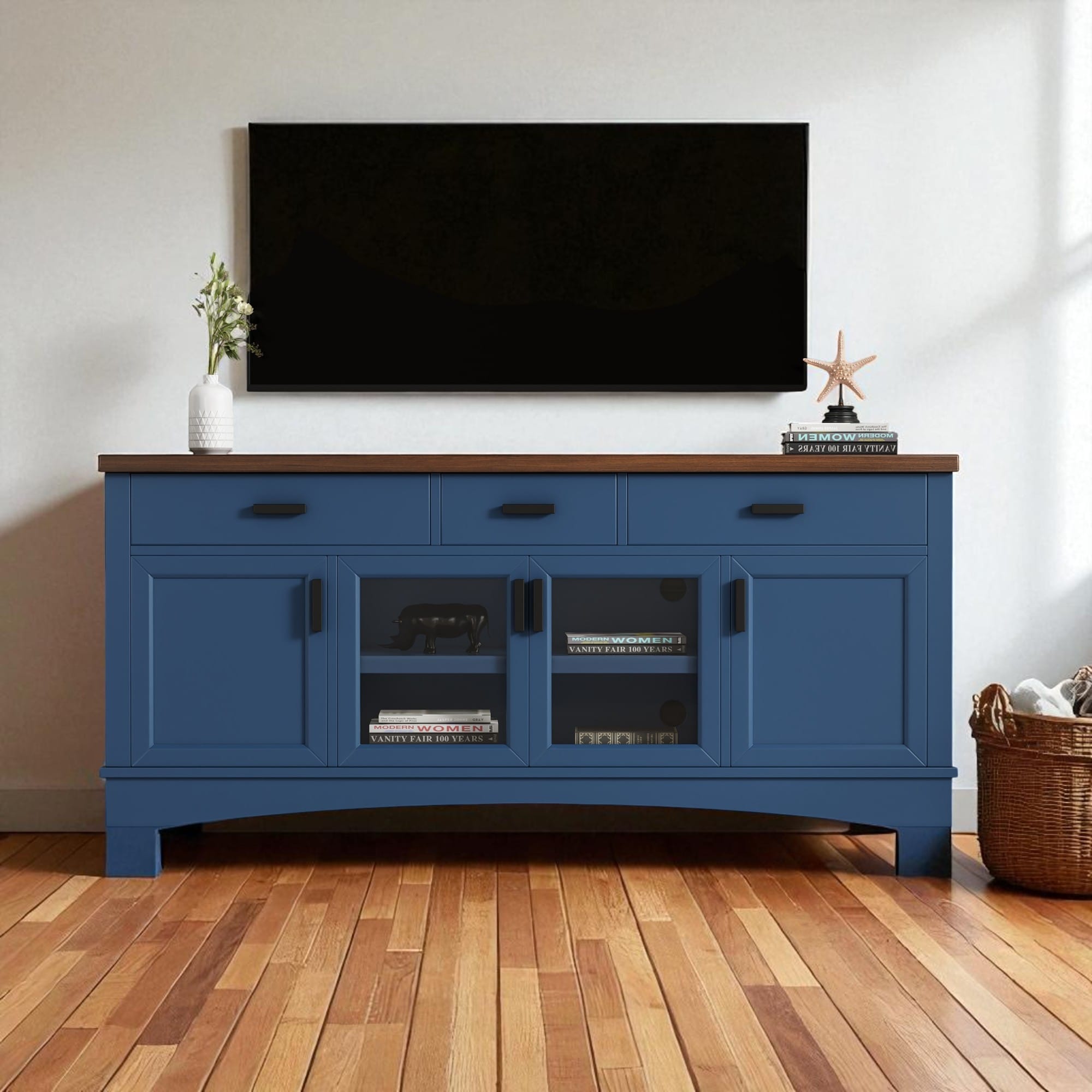67 Inch TV Stand with Glass Doors, Storage Drawers and Adjustable Shelves, Modern Media Console Cabinet for TVs Up to 65 Inch