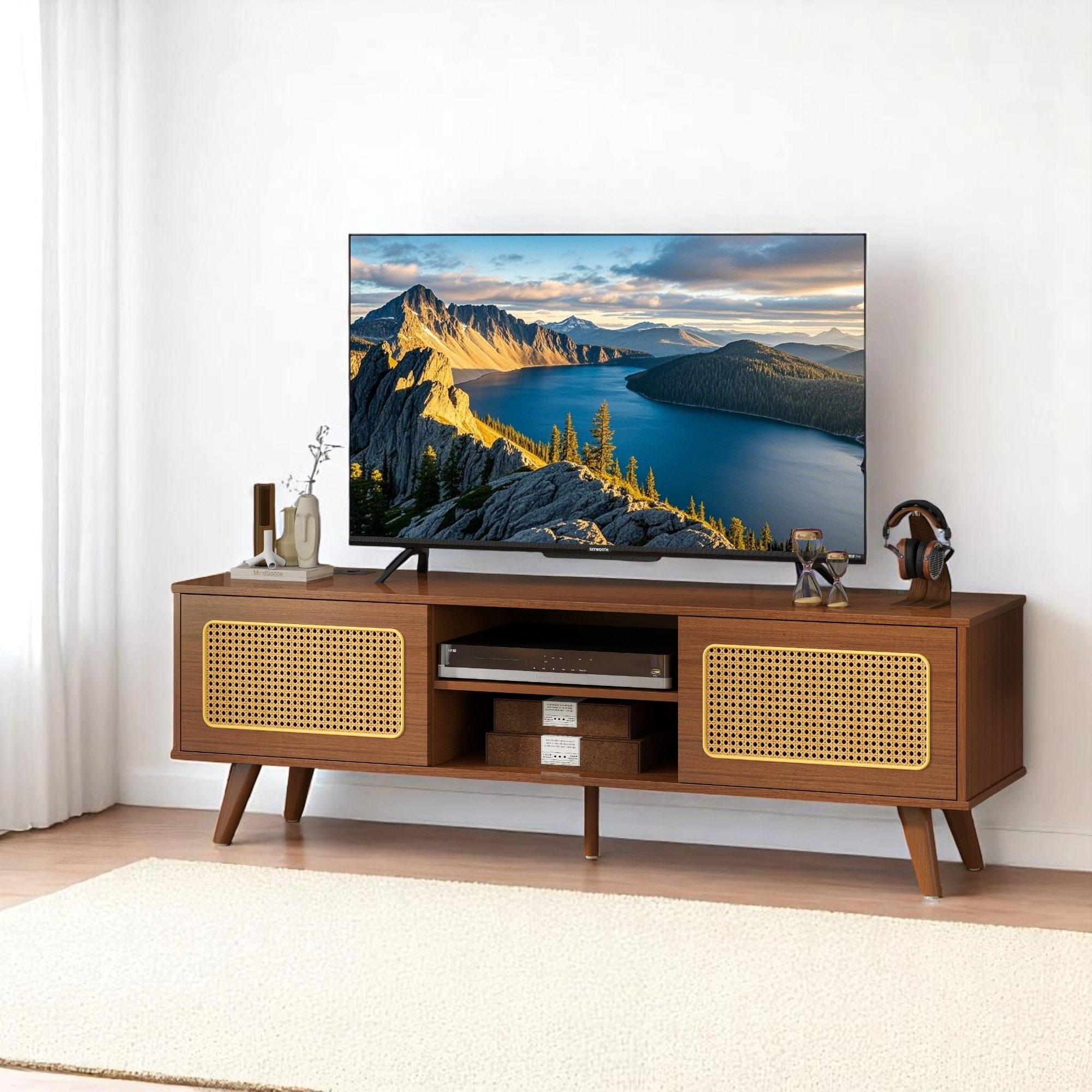 Mid Century Modern Rattan TV Stand for 55-65 Inch TVs, Media Console with Sliding Doors and Charging Station, Solid Wood Legs