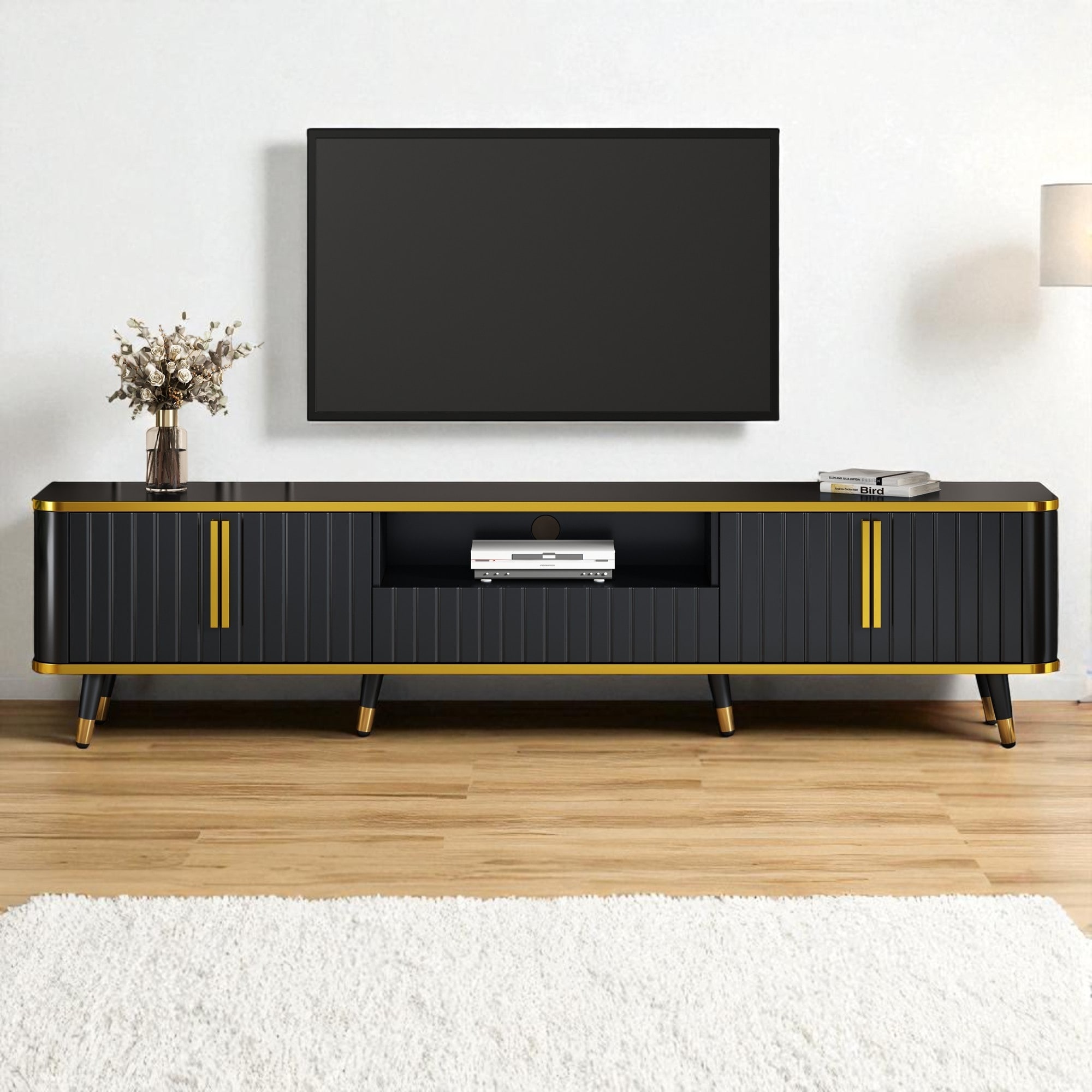Modern TV Stand with Cabinets, Drawer & Open Shelf for TVs Up to 85", Modern Entertainment Center with Gold Accents