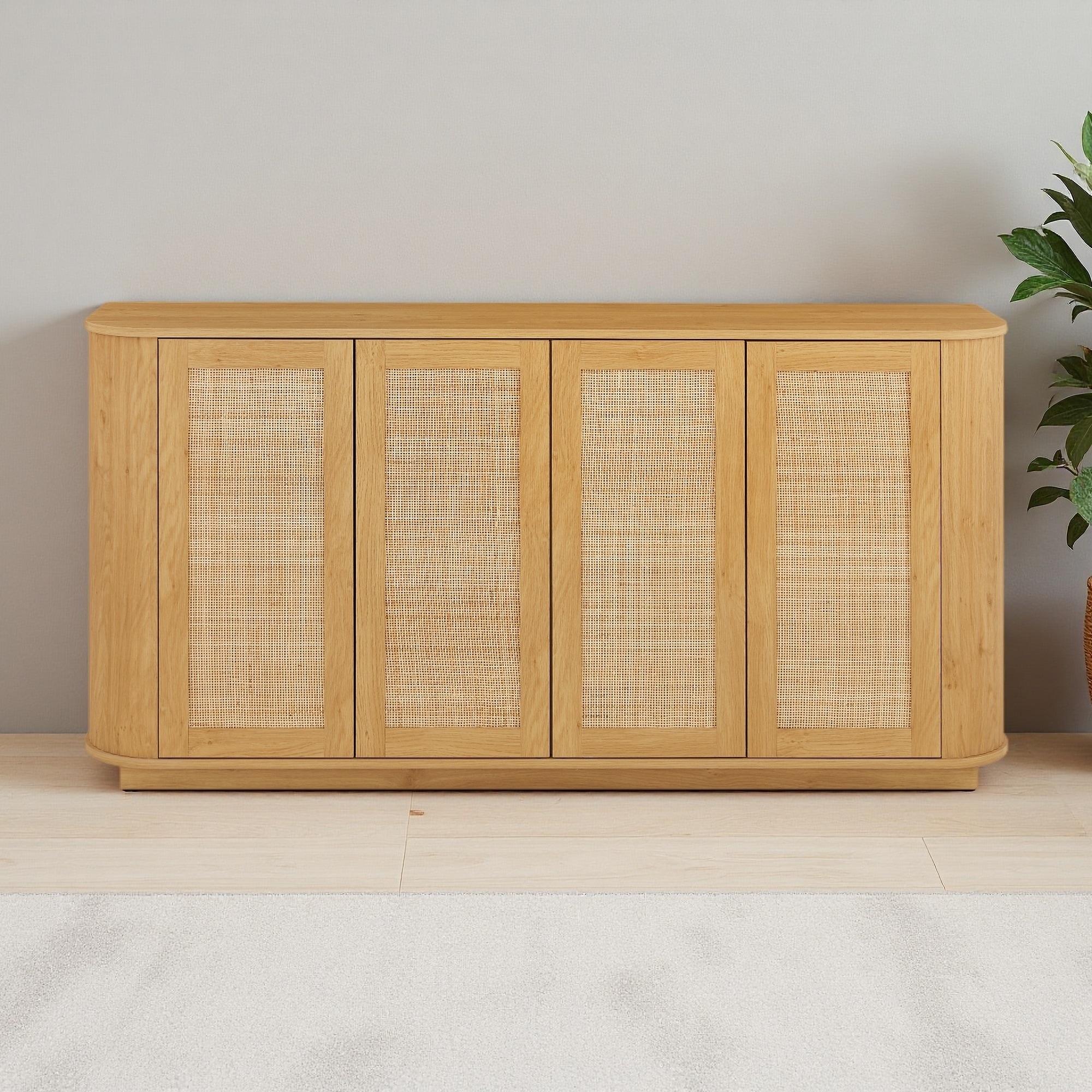 64" Wood TV Stand with Rattan Doors, Pressed Spring Doors & Adjustable Shelves