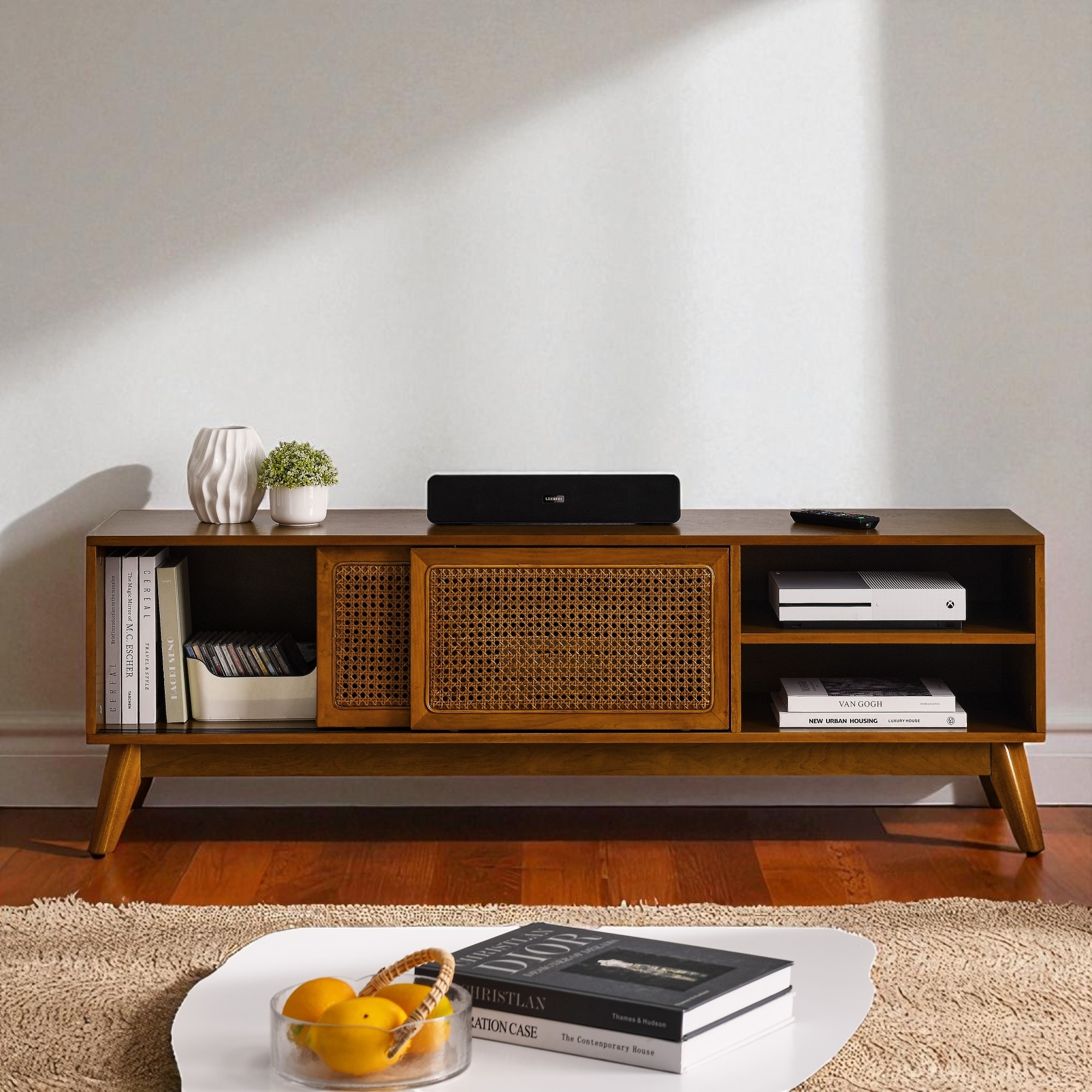 59 Inch Mid Century Modern Rattan TV Stand, Entertainment Cabinet with Sliding Doors, Media Console for TVs Up to 65 Inch