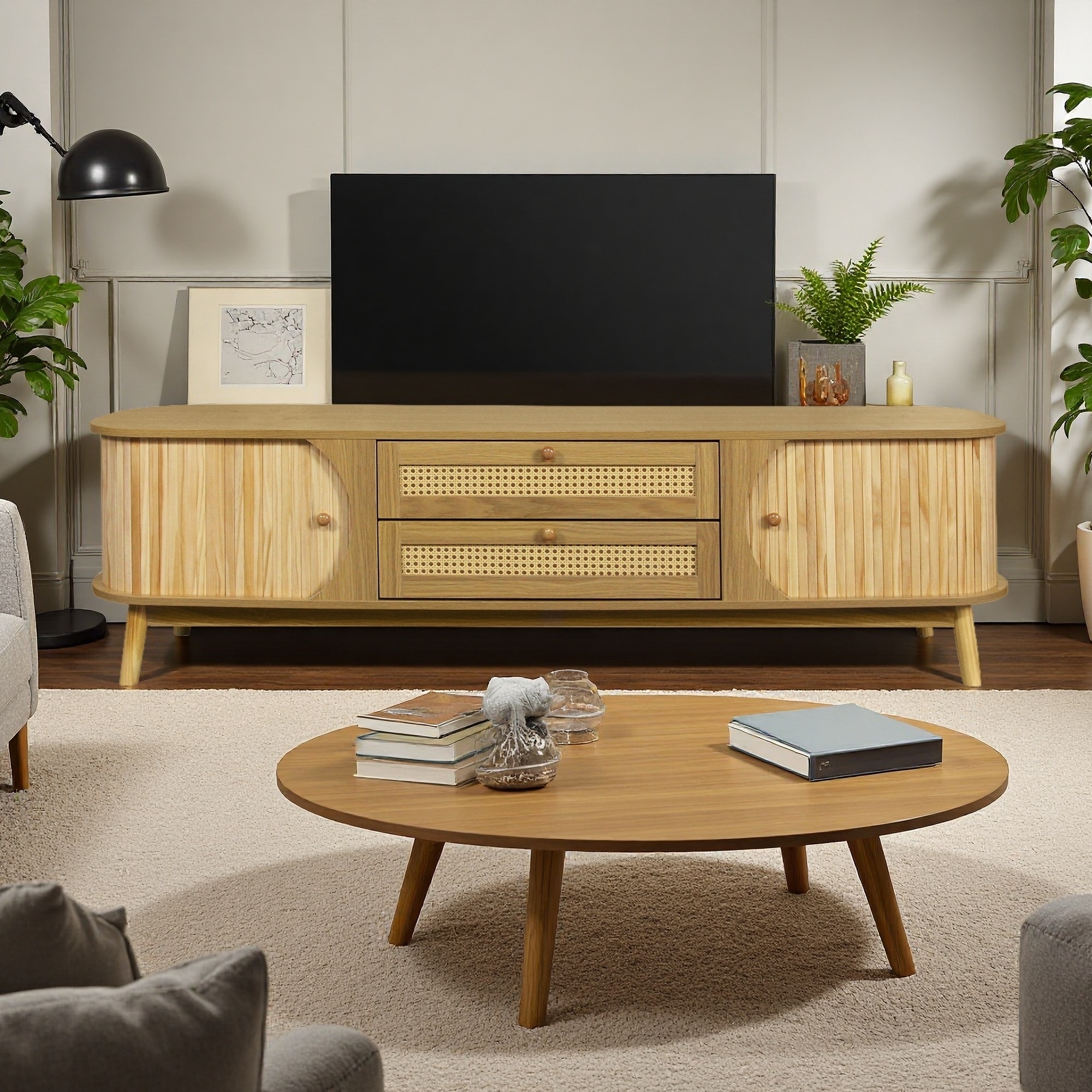66.9" MDF Rattan-Style TV Stand with Sliding Doors & Drawers