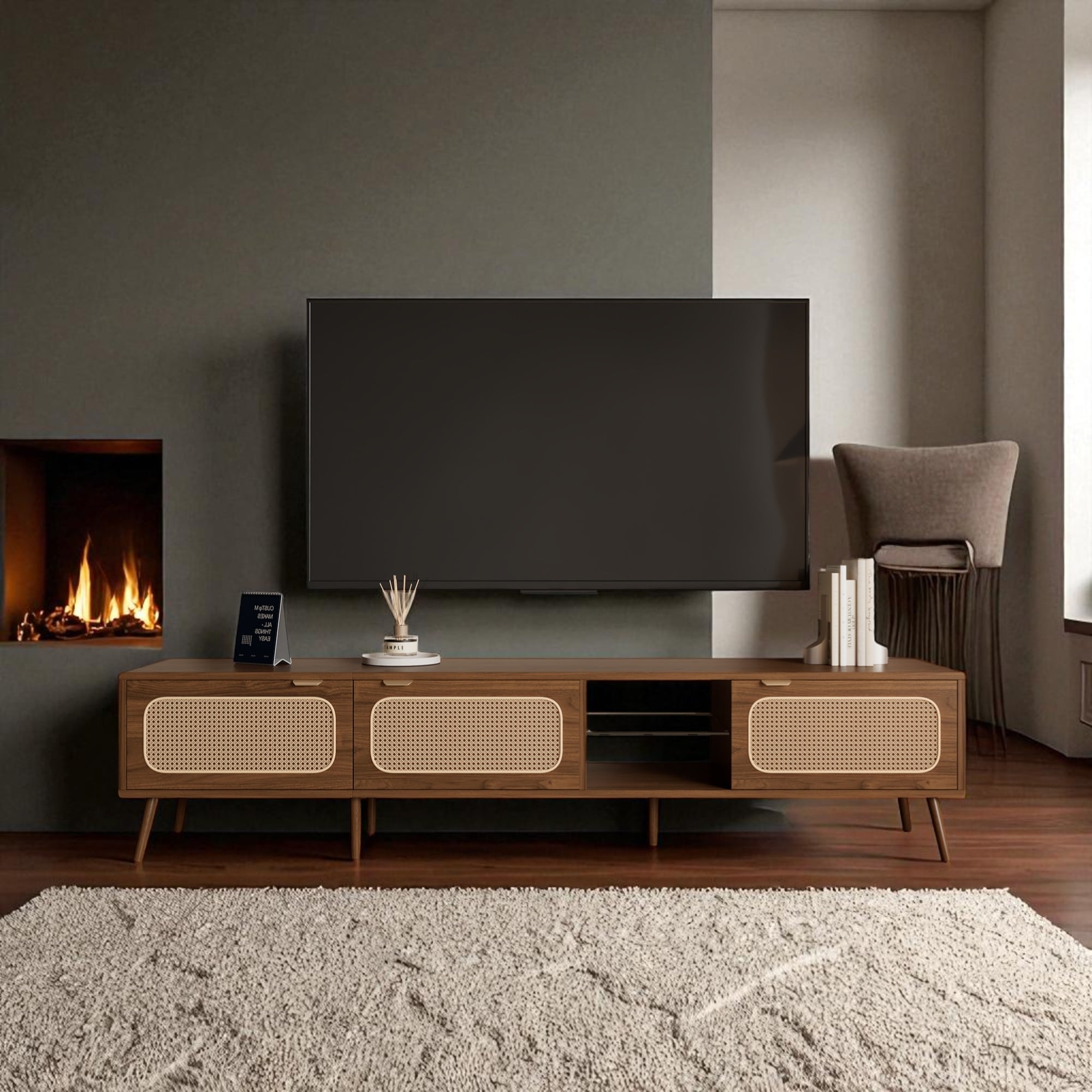 75-inch Rattan TV Stand - Modern Farmhouse Media Console with Solid Wood Legs