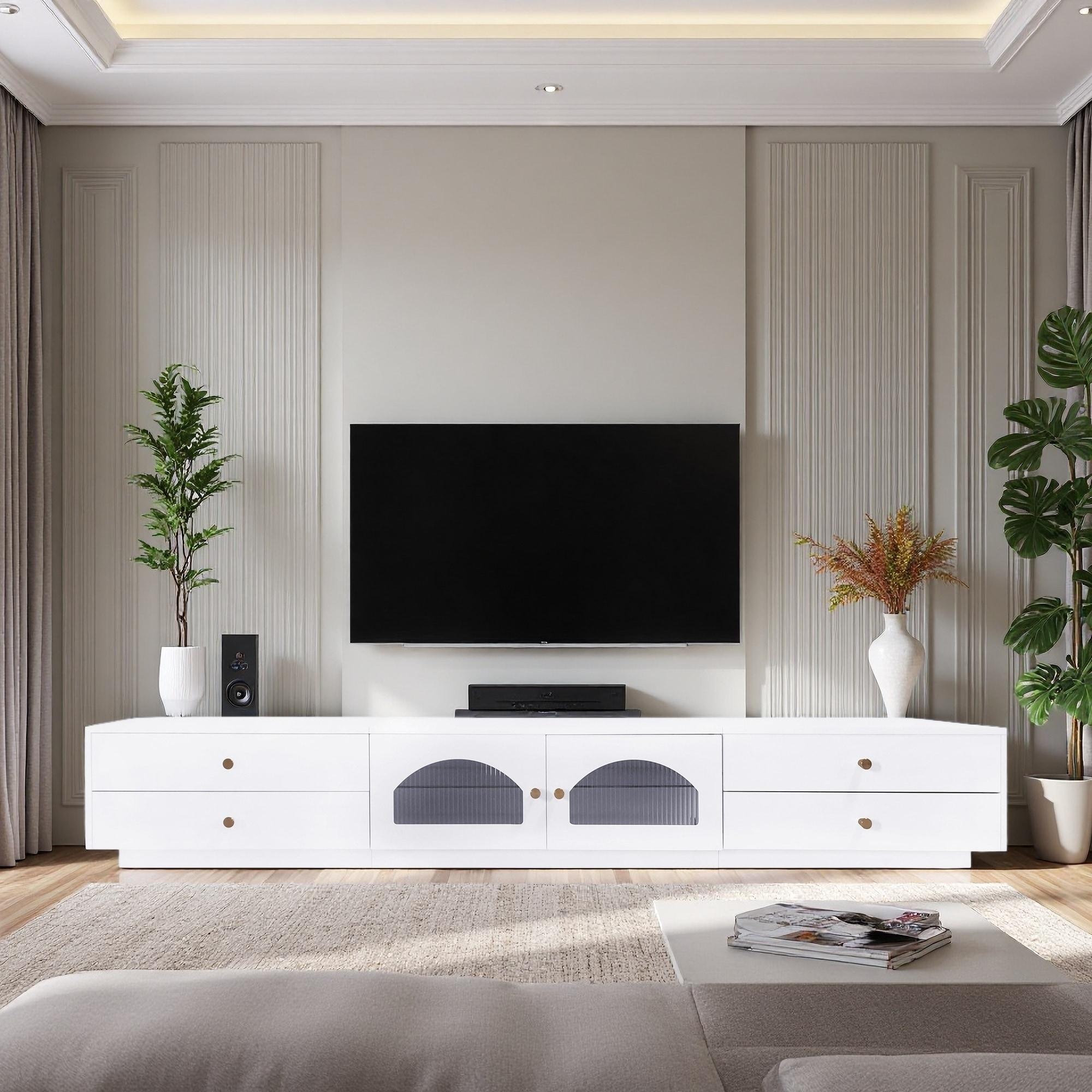 86.6" Particle Board TV Stand with Fluted Glass Doors, Drawers & Tempered Glass Shelf