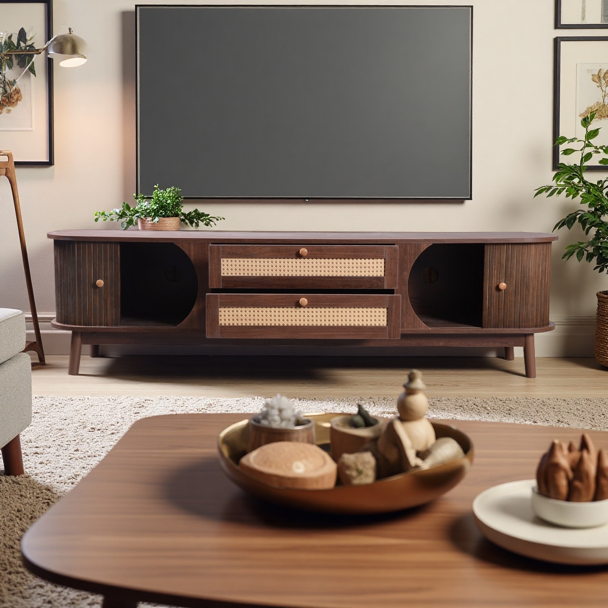 66.9" MDF Rattan-Style TV Stand with Sliding Doors & Drawers