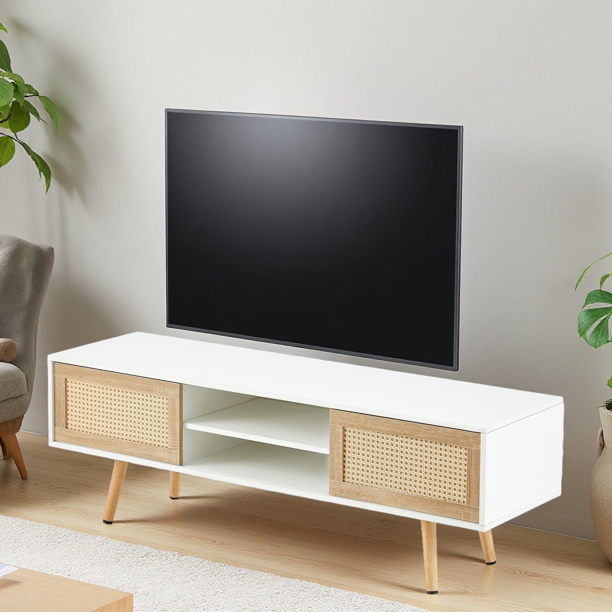 55.12" Rattan TV Cabinet with Double Sliding Doors & Adjustable Shelf