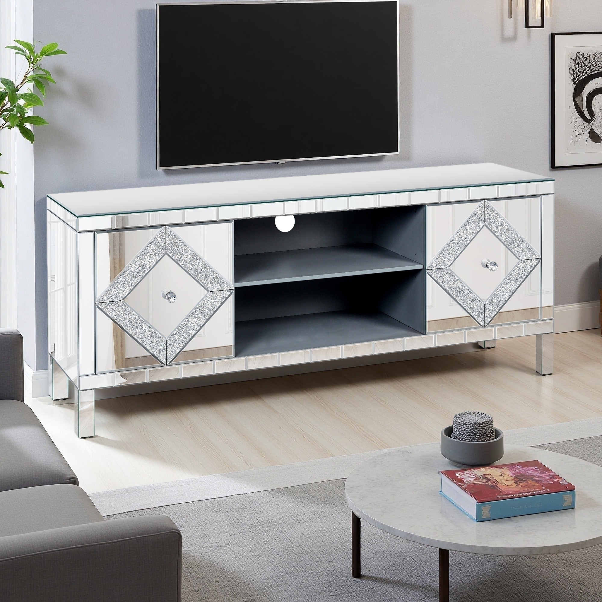 60" Mirrored TV Stand for 65+ Inch TVs with 2 Cabinets & Open Storage