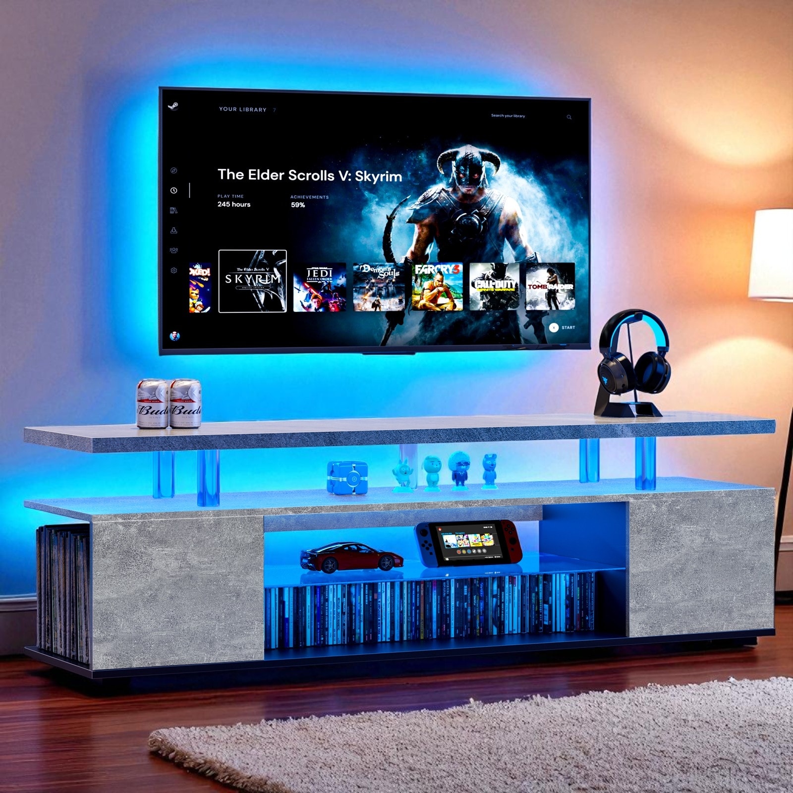 TV Stand for 70 Inch TV, LED Gaming Entertainment Center with Storage Cabinet & Shelves, Modern Media Console for Living Room