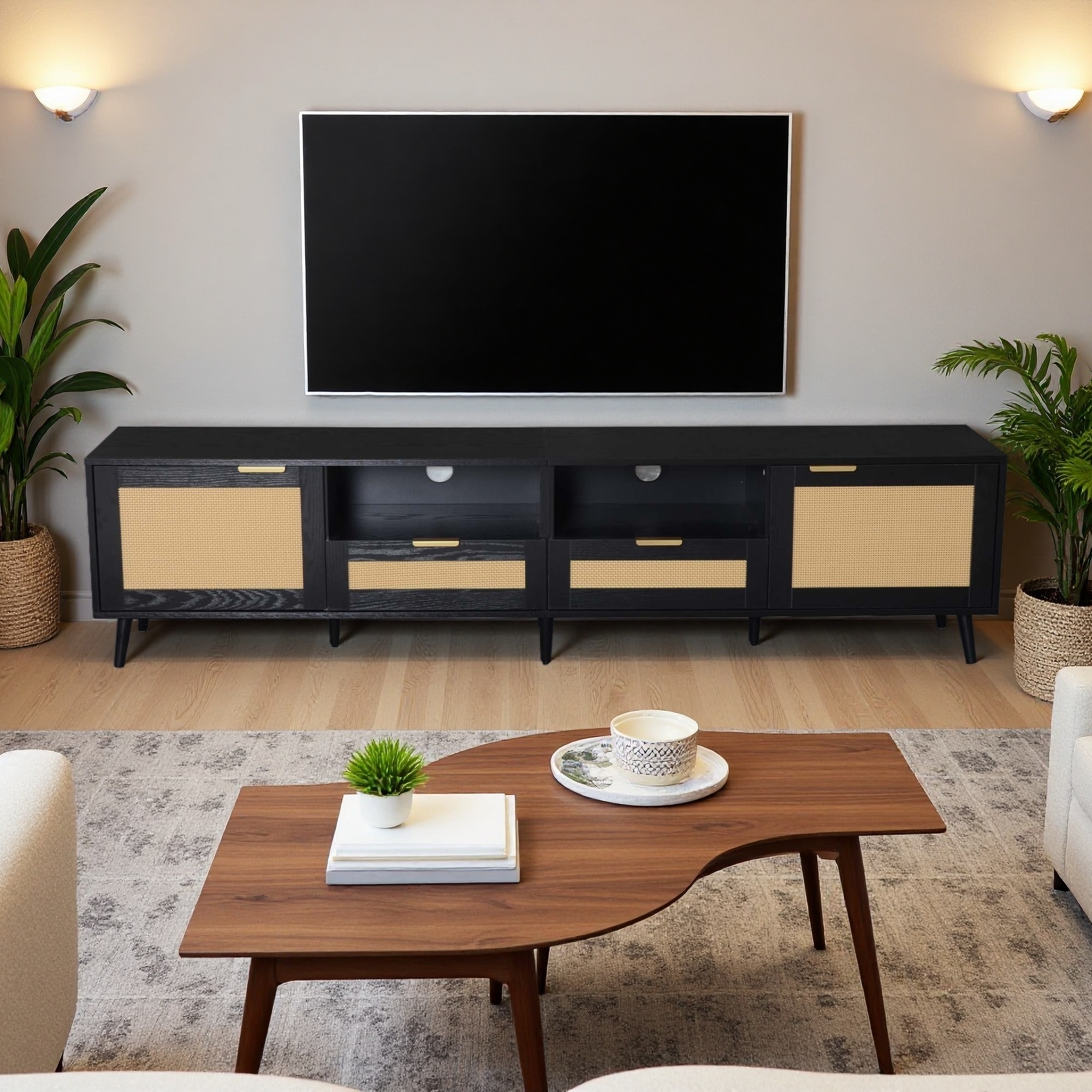 78.7" MDF Rattan Modern Farmhouse TV Stand with Solid Wood Legs and Multi-Functional Storage for Living Room