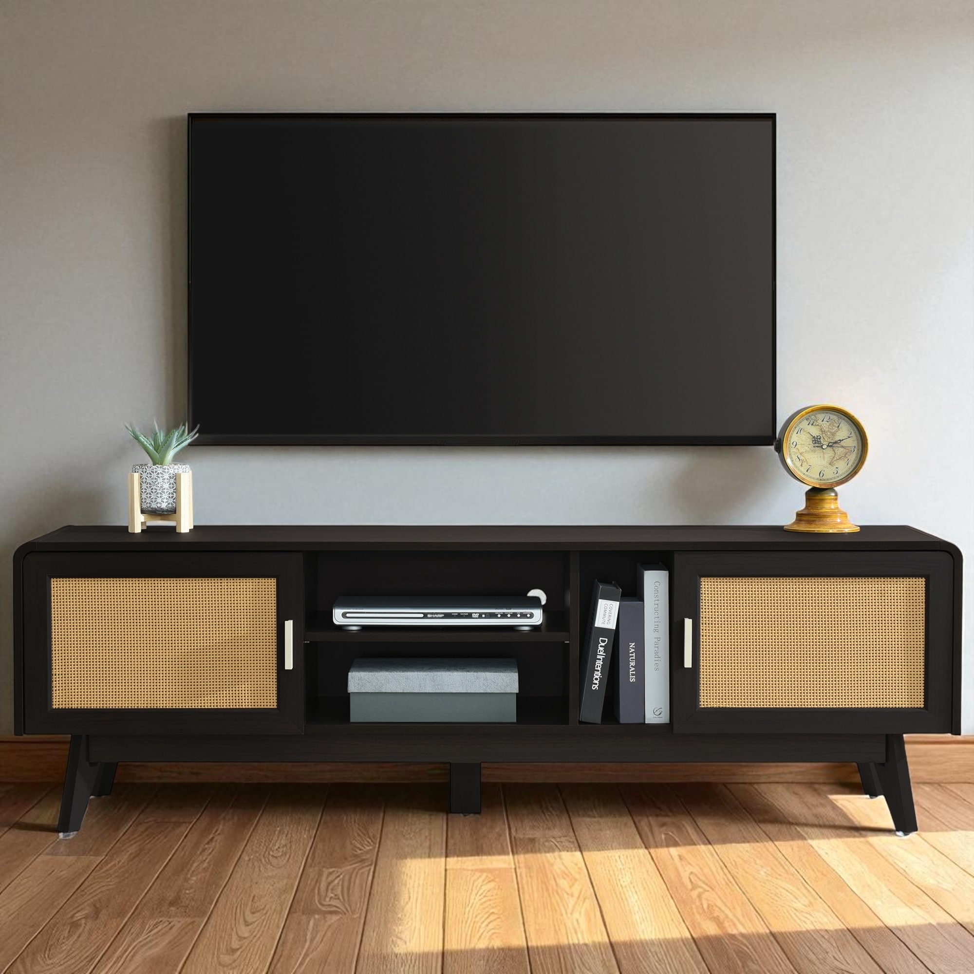 63'' Rattan TV Stand for 65 Inch TVs, Boho Entertainment Center with 2 Cabinets, 3 Open Shelves, Solid Wood Legs and Storage