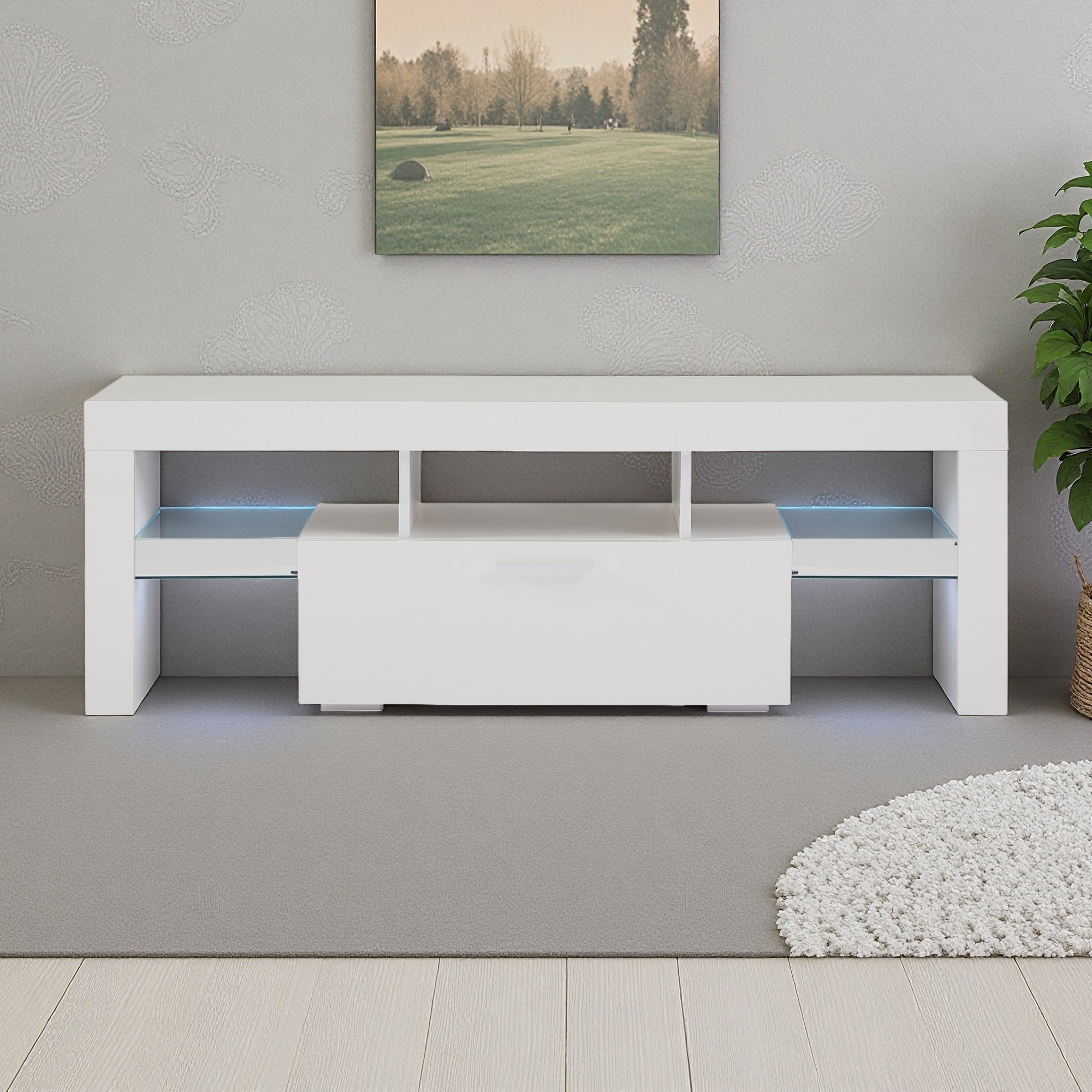 Modern TV Stand with LED Lights, Glass Shelves & Storage Drawers, 65"