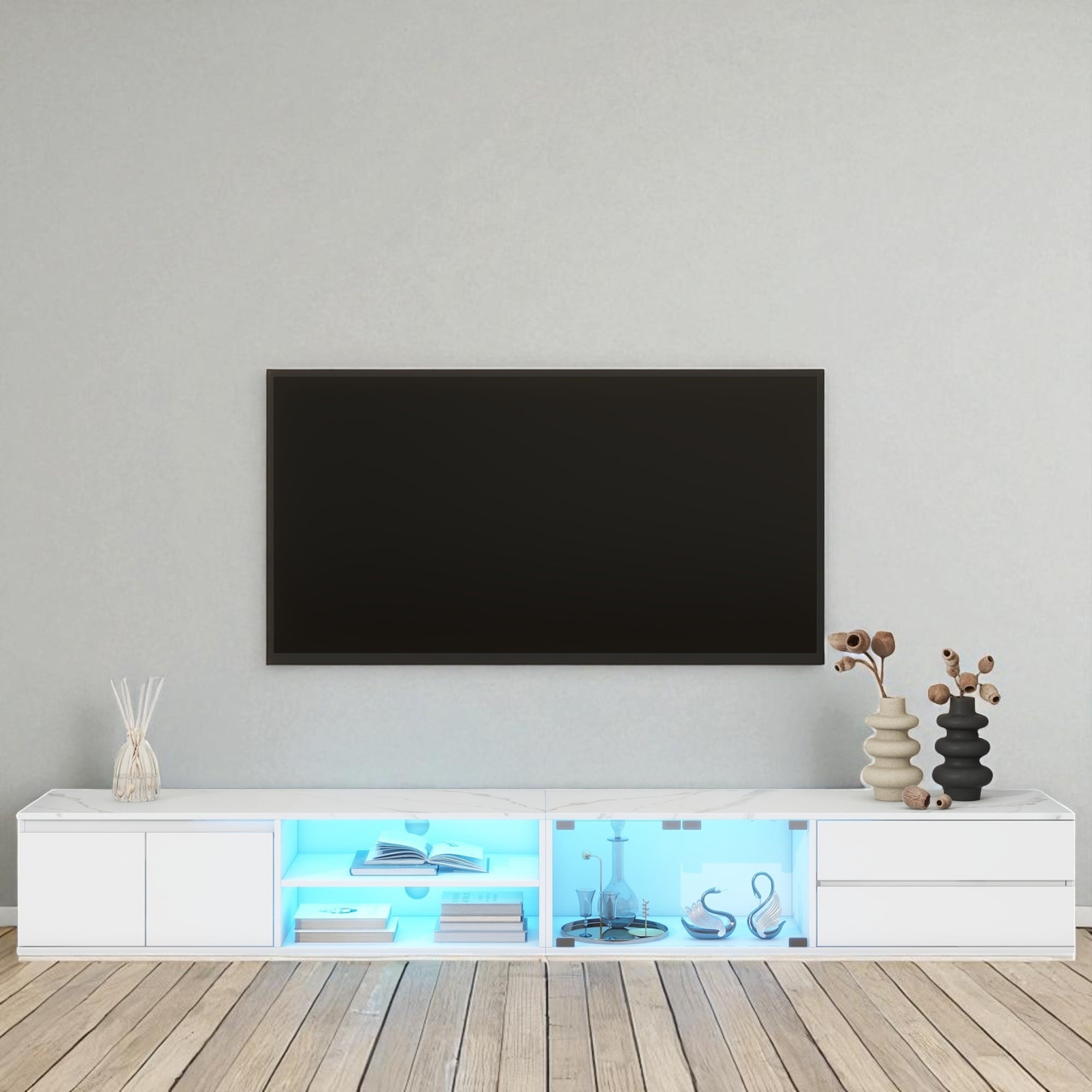LED TV Stand with APP Control, Faux Marble Top Entertainment Center for TVs Up to 105'', Glass Doors, Drawers and Cabinets