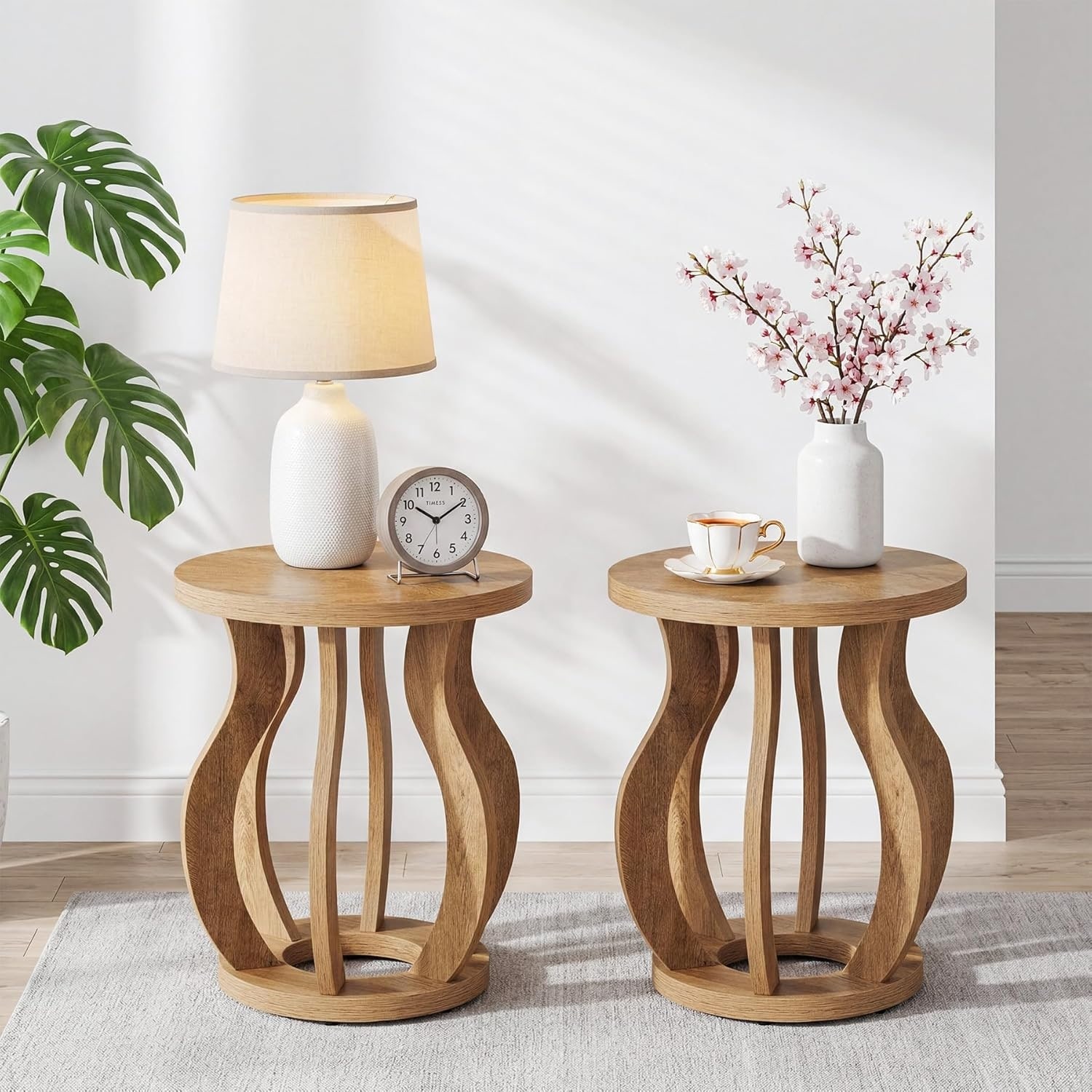 Round End Side Table with Curved Frame, Farmhouse Wooden Accent Nightstand for Bedroom, Small Spaces
