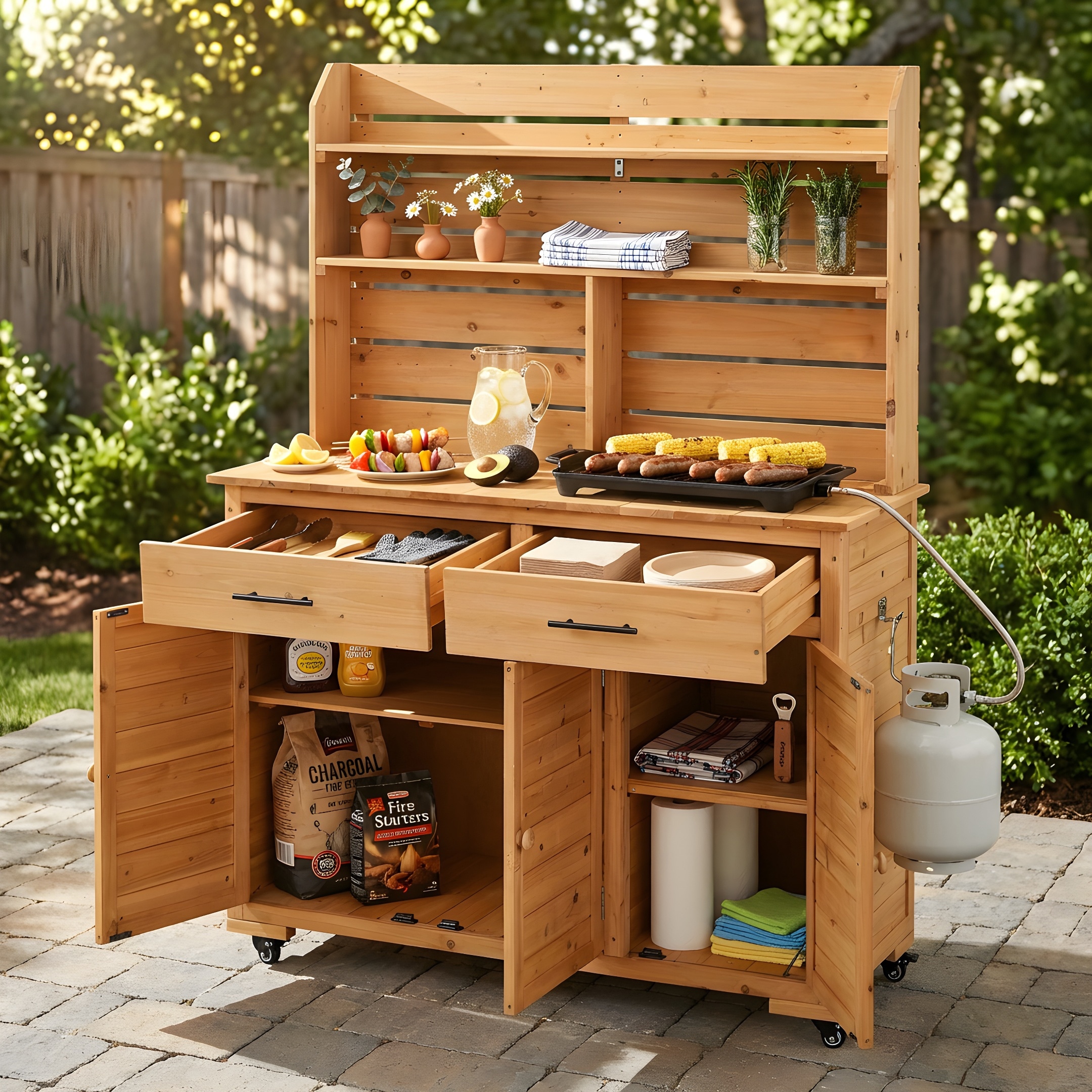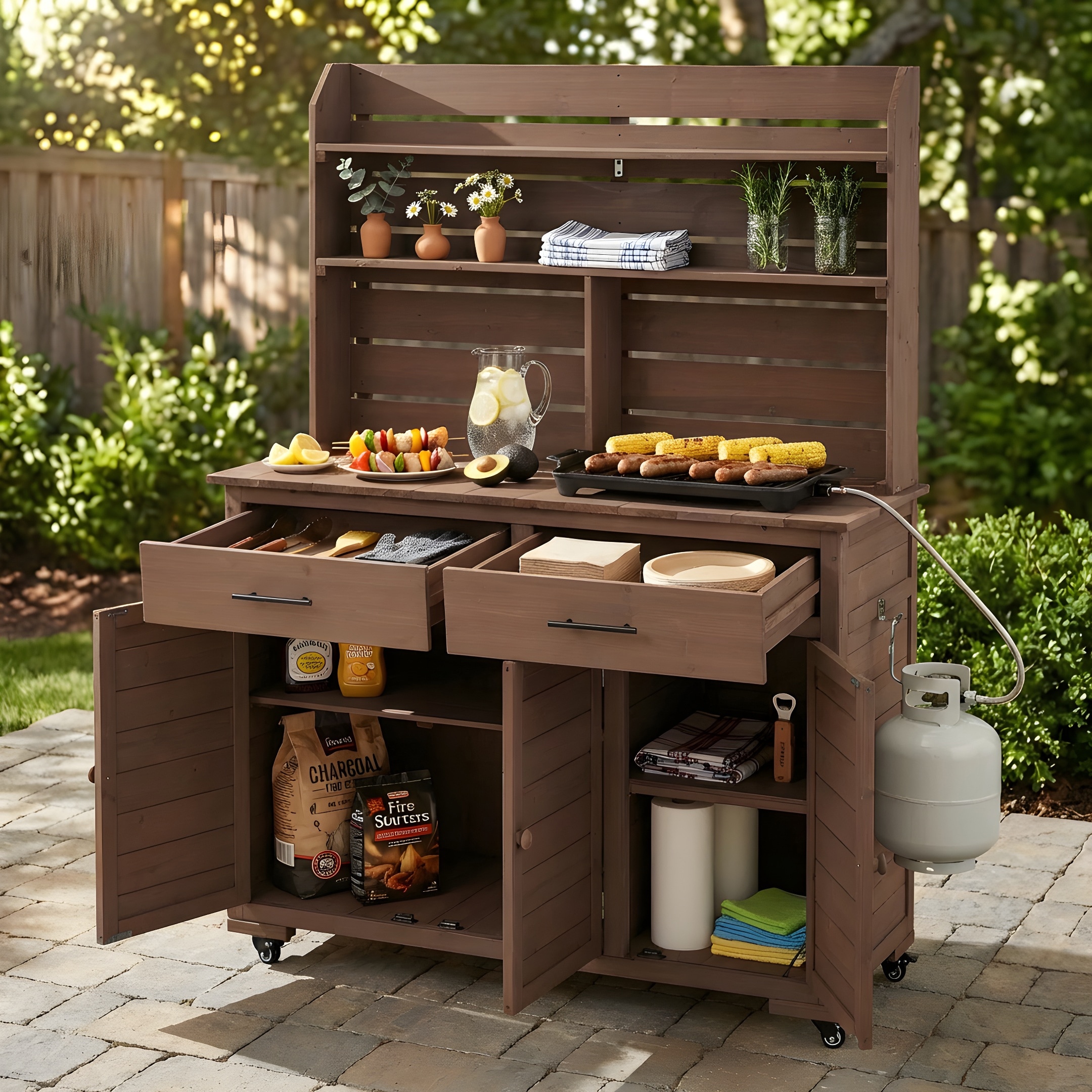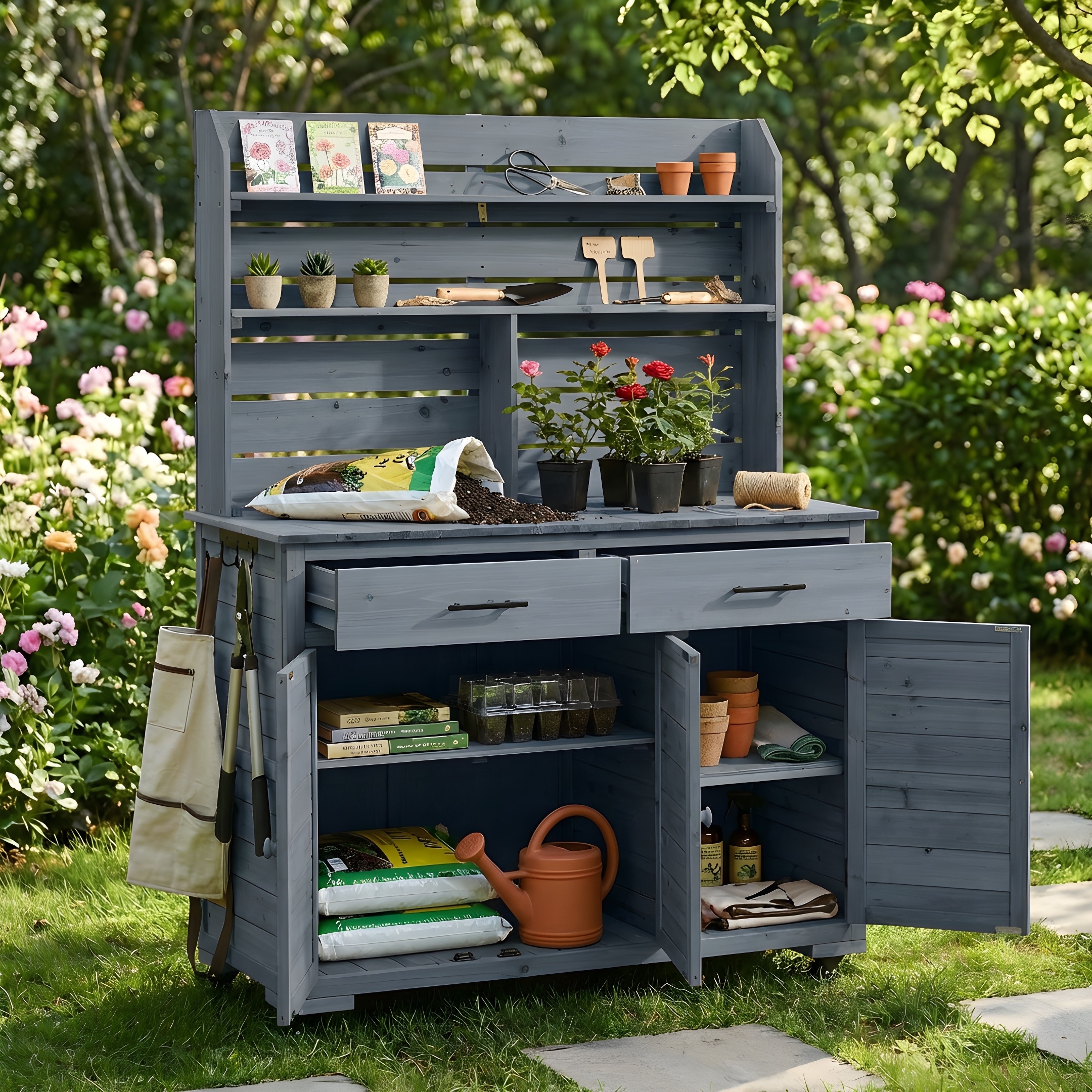 65"H Large Garden Potting Bench with Lockable Wheels and Storage Cabinet, Wood Cart with Hutch Top, Drawers and Removal Shelves