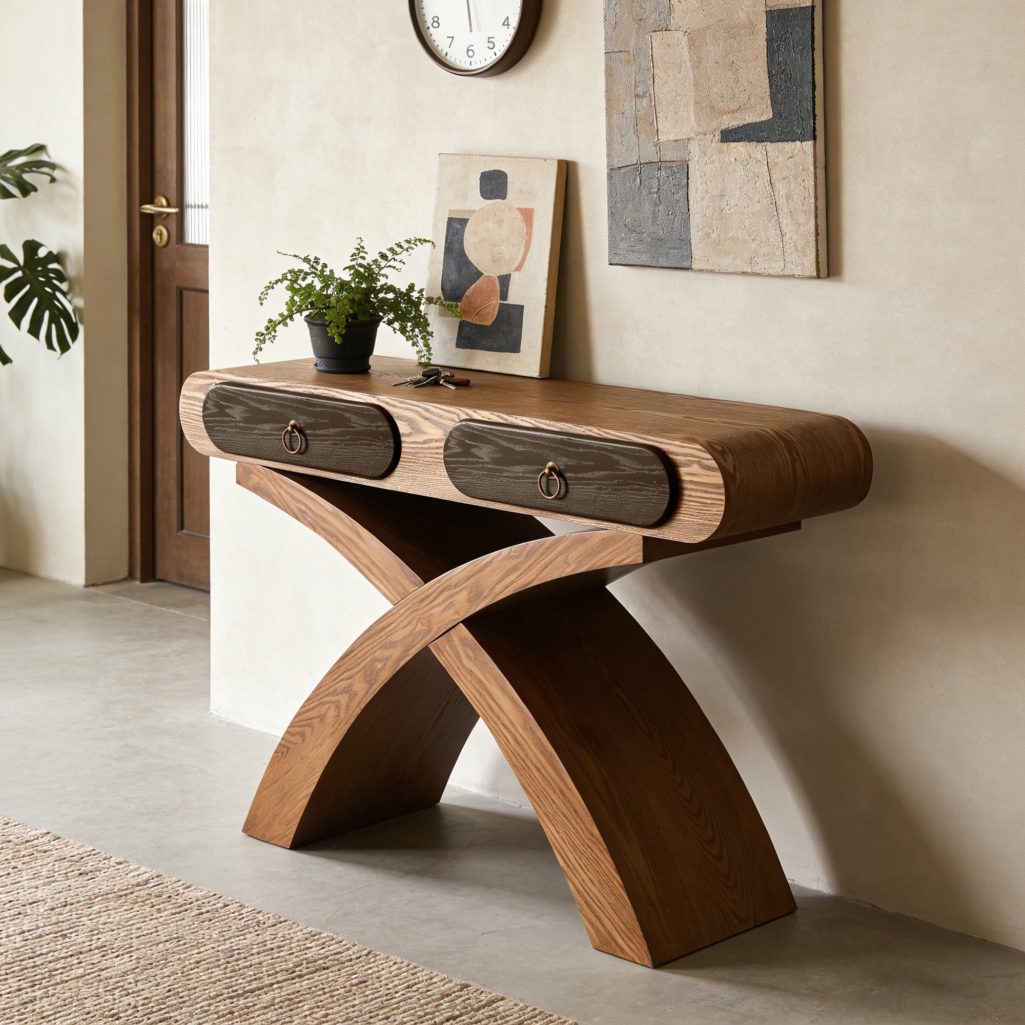 Ashwood veneered console table with cross leg, Two Handle Drawers, Console Table ,Easy Assembly