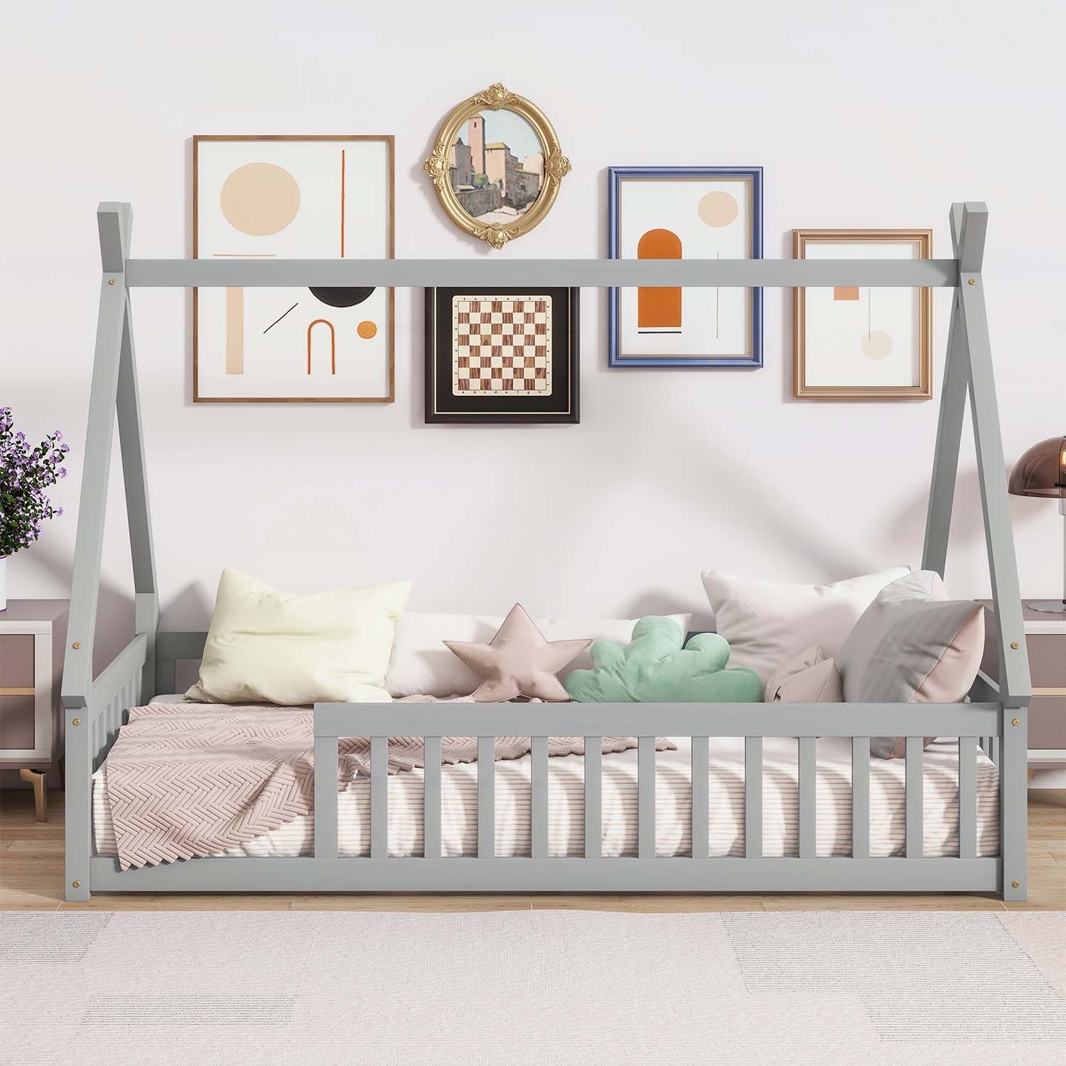 Twin Tent-shaped Teepee Bed with Guardrails and Slats for Cozy and Safe Sleepin