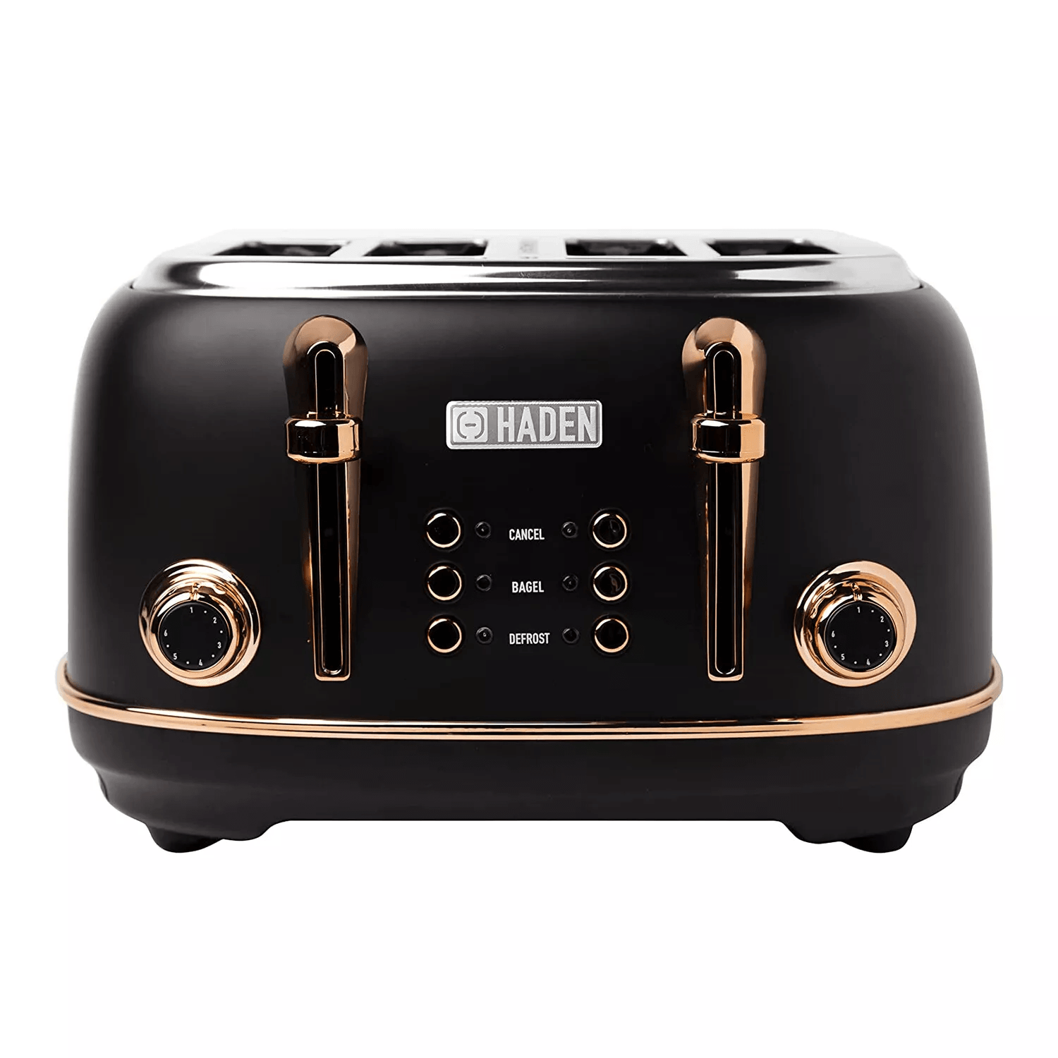 Haden Heritage 4 Slice Wide Slot Stainless Steel Toaster, Black & Copper Retro Design, Bagel & Defrost Functions Haden Heritage 4 Slice Wide Slot Stainless Steel Toaster, Black & Copper Retro Design, Bagel & Defrost Functions