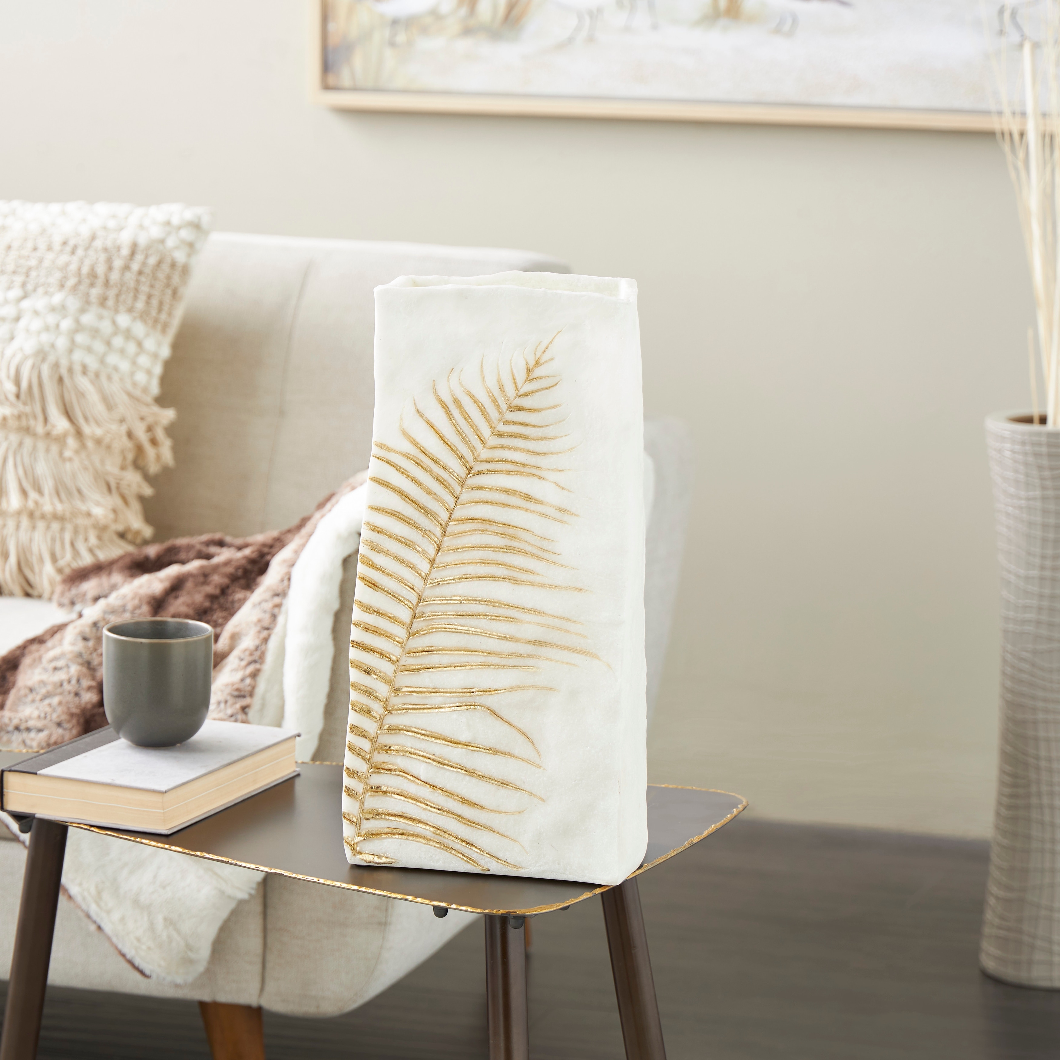 White Polystone Vase with Gold Leaf Imprint