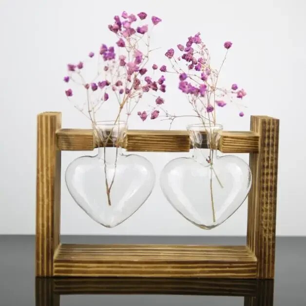 Vintage Wooden Frame Glass Vase: Hydroponic Plant Holder For Table Desktop, Heart Shape Home Decoration & Wedding Vase Color: Type A Double Bottle