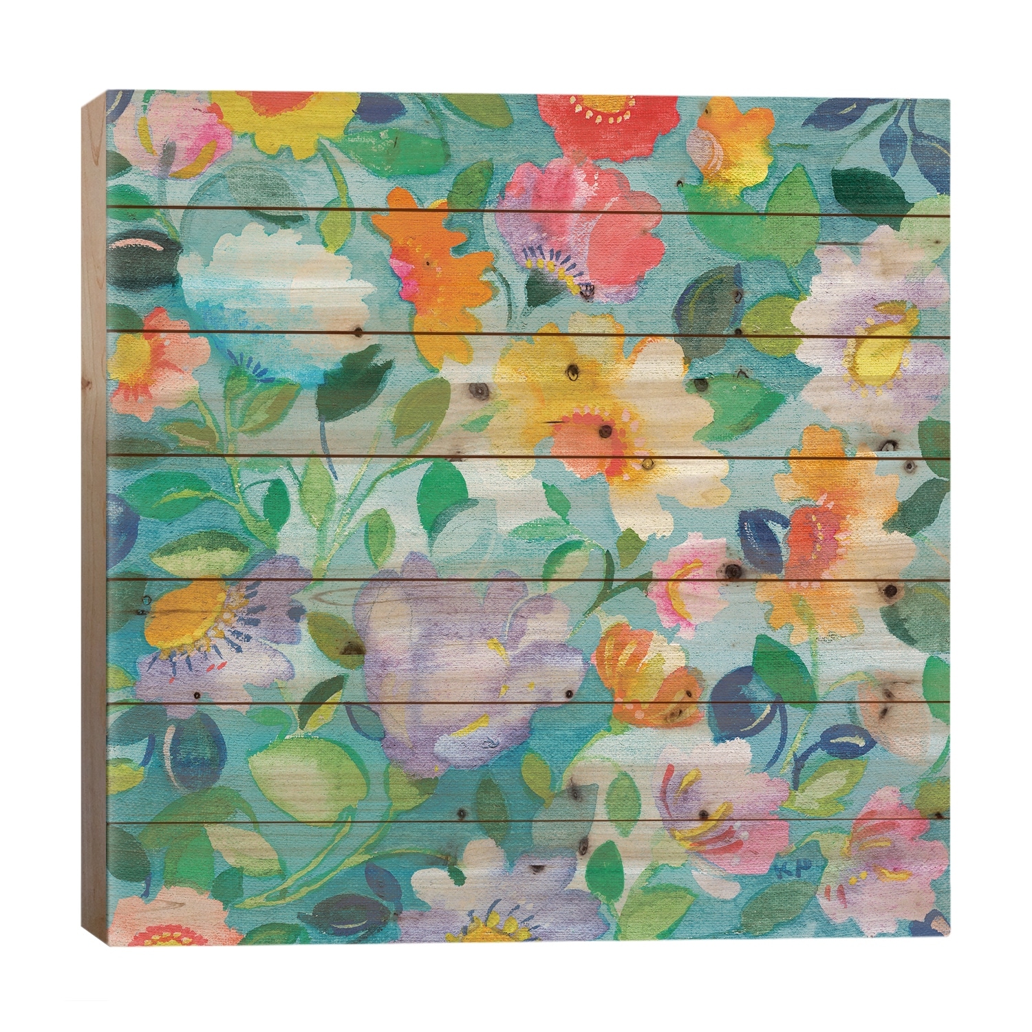 Turquoise Flowers Print On Wood by Kim Parker - Multi-Color