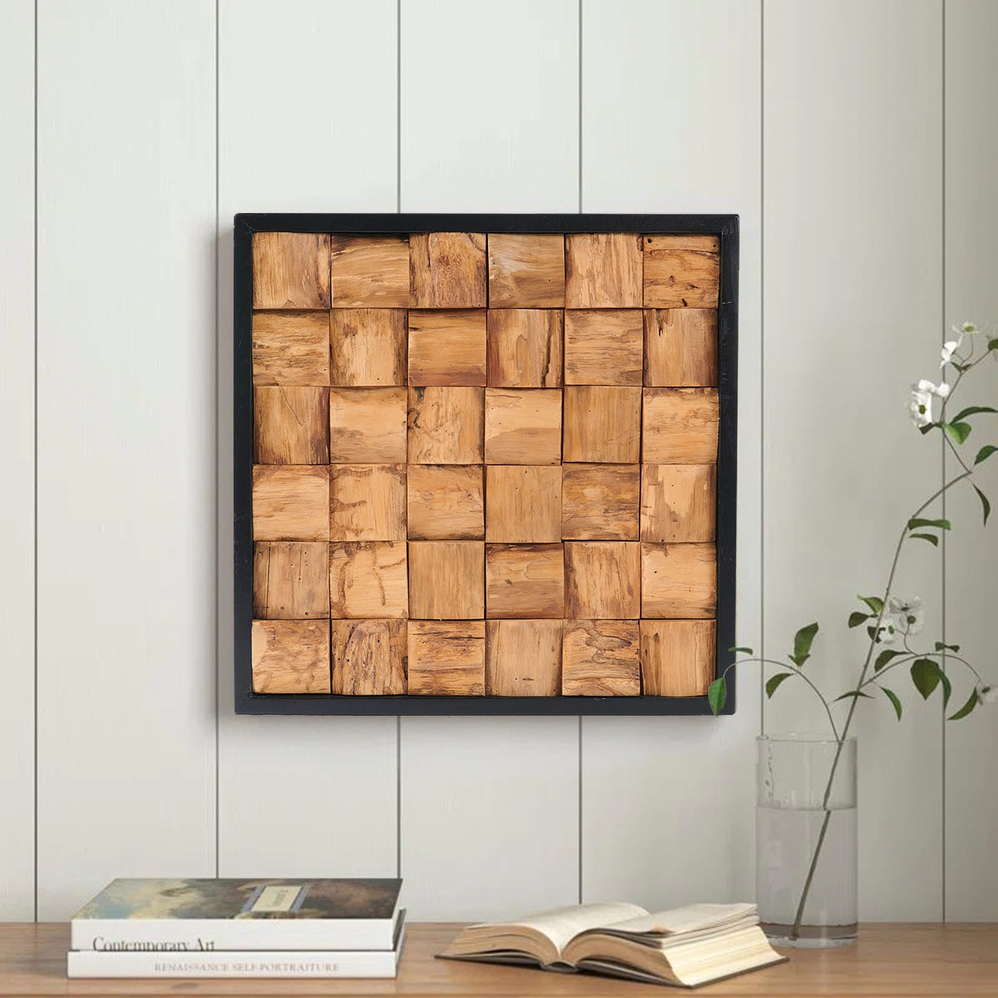 Teak Wood Square Wall Decor Geometric Pattern Hanging Decoration