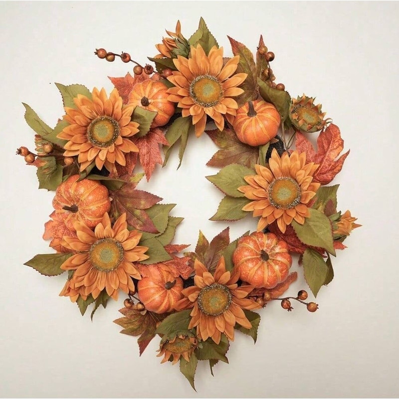 20" Autumn Wreath with Sunflowers Pumpkins & Maple Leaves, Harvest Front Door & Wall Seasonal Decor for Thanksgiving - N/A