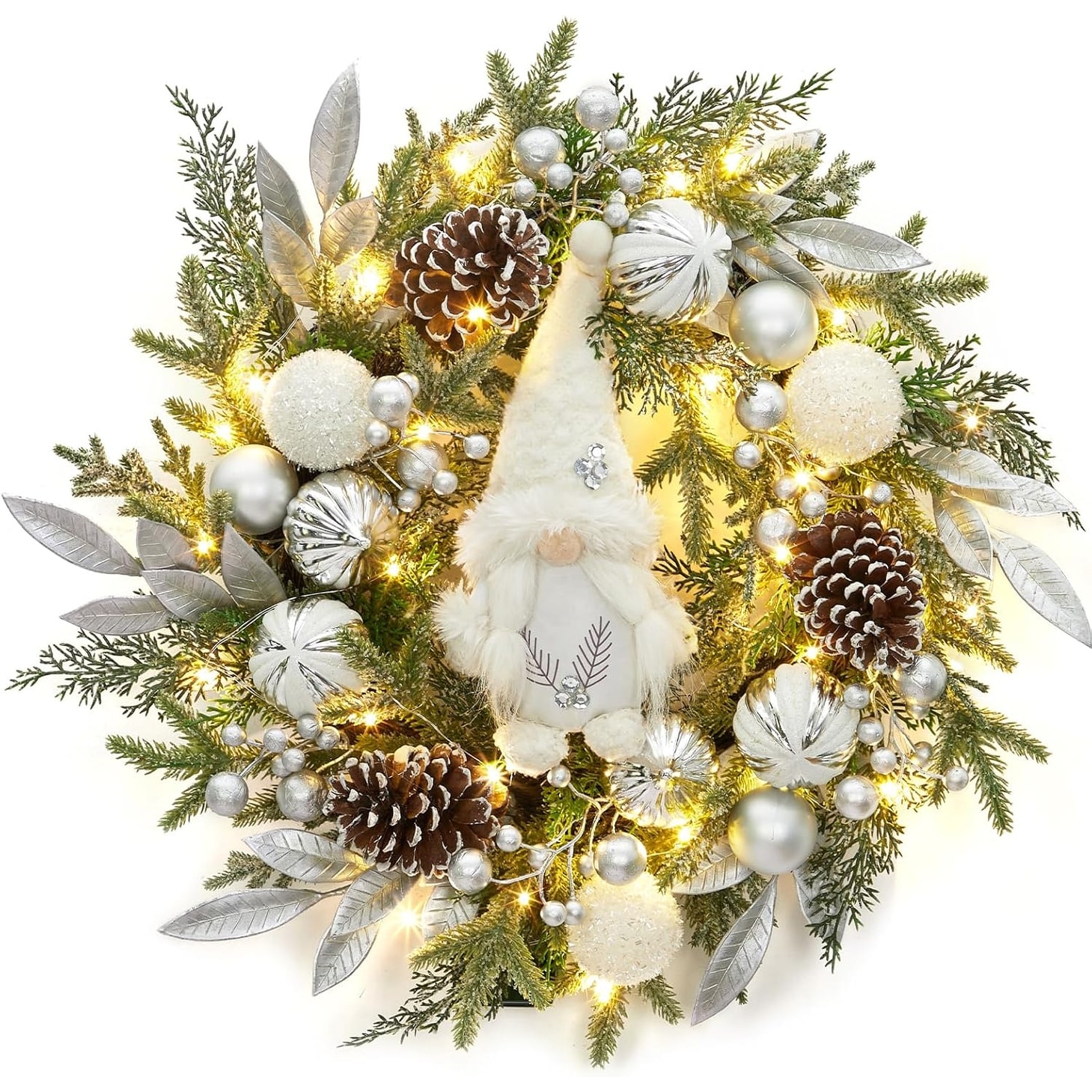 22" Silver Christmas Wreath with Glitter Ornaments & Gnomes, Winter Holiday Door or Window Decoration