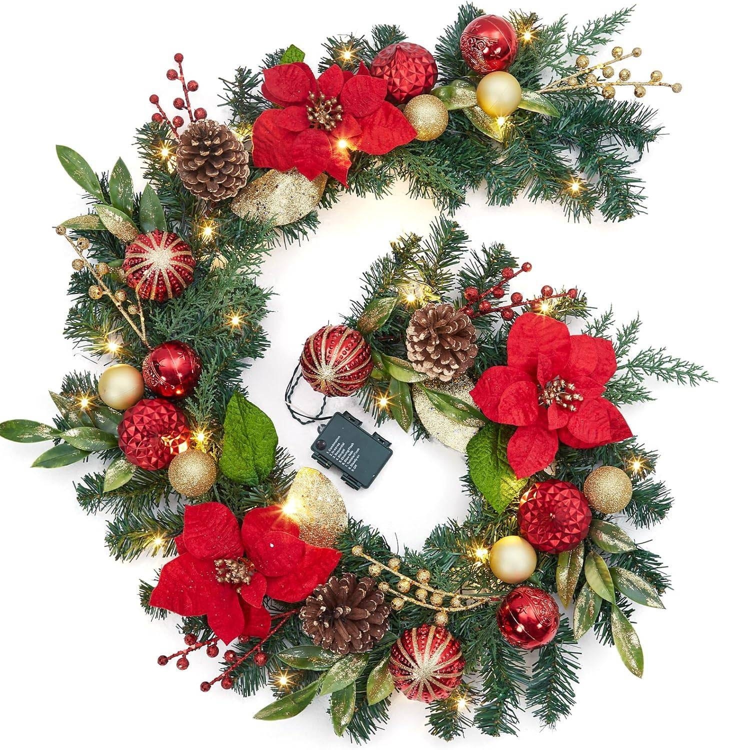 6ft Pre-Lit Outdoor Christmas Garlands with LED Lights Red Gold Balls Flowers - N/A
