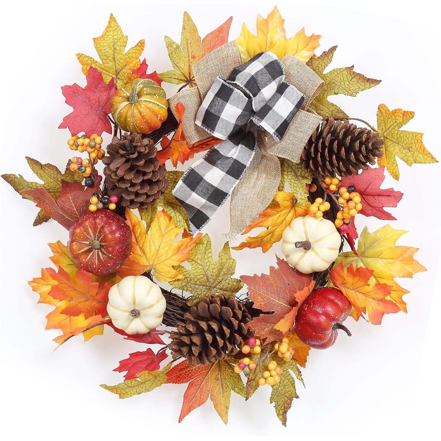 20" Thanksgiving Wreath with Pumpkins & Maple Leaves, Fall Door Decor for Porch or Wall Holiday Display