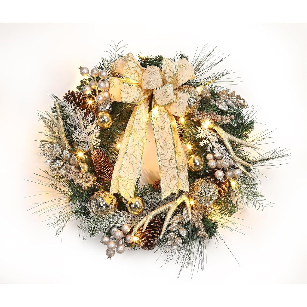 24" Pre-Lit Christmas Wreath with Gold Ornaments, Antlers & Bows, Battery Holiday Decor for Front Door