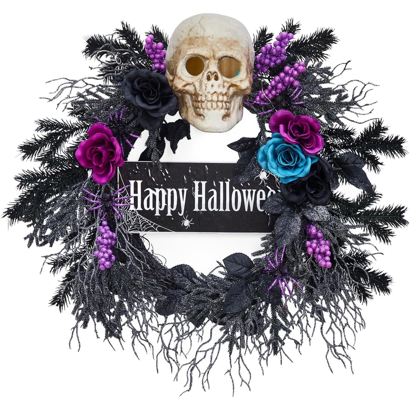 22" Halloween Skeleton Wreath with Lights, Black & Purple Flowers, Spooky Indoor Outdoor Door Decor