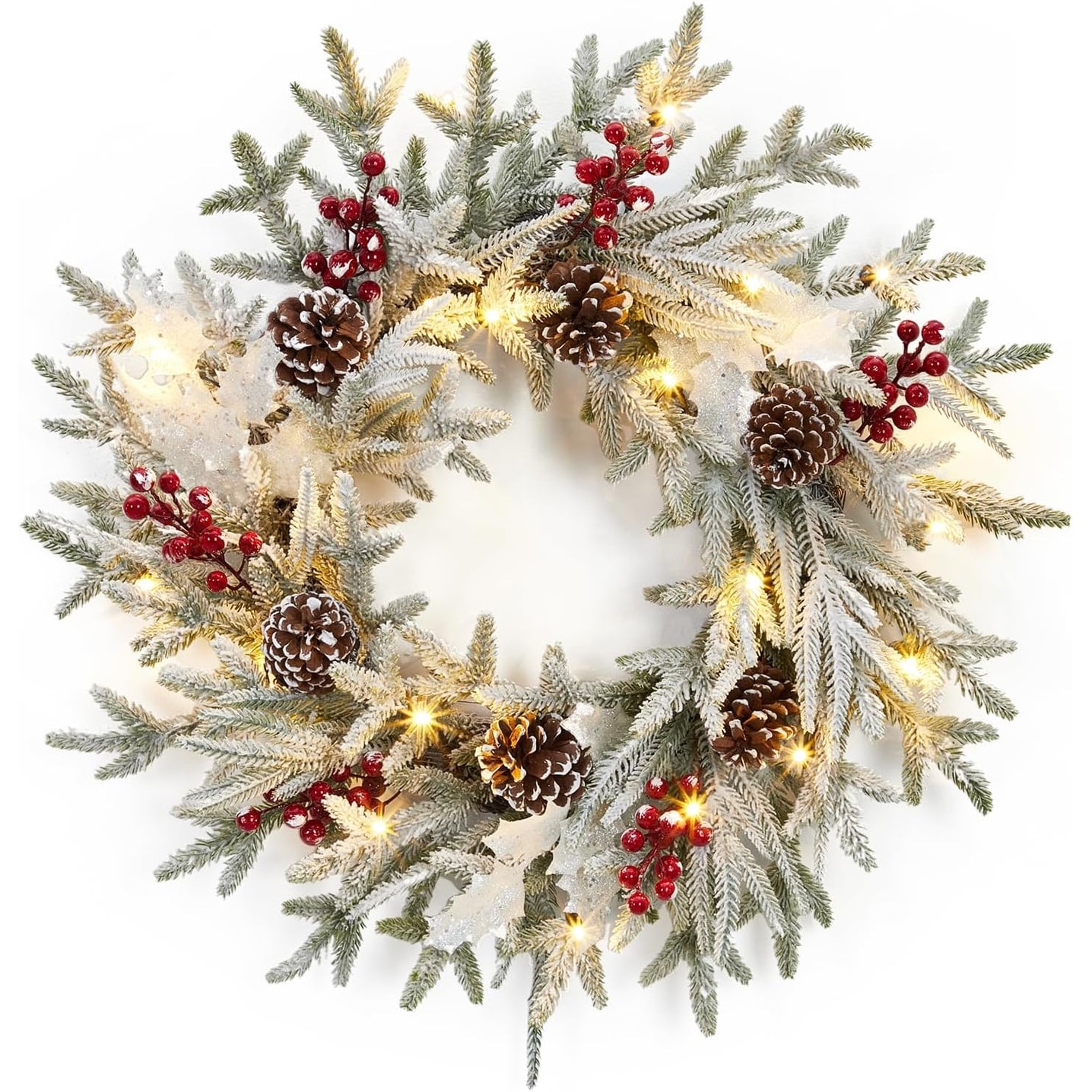 24 in Christmas Wreath with Lights, Snow Flocked Outdoor Christmas Wreaths for Front Door - N/A