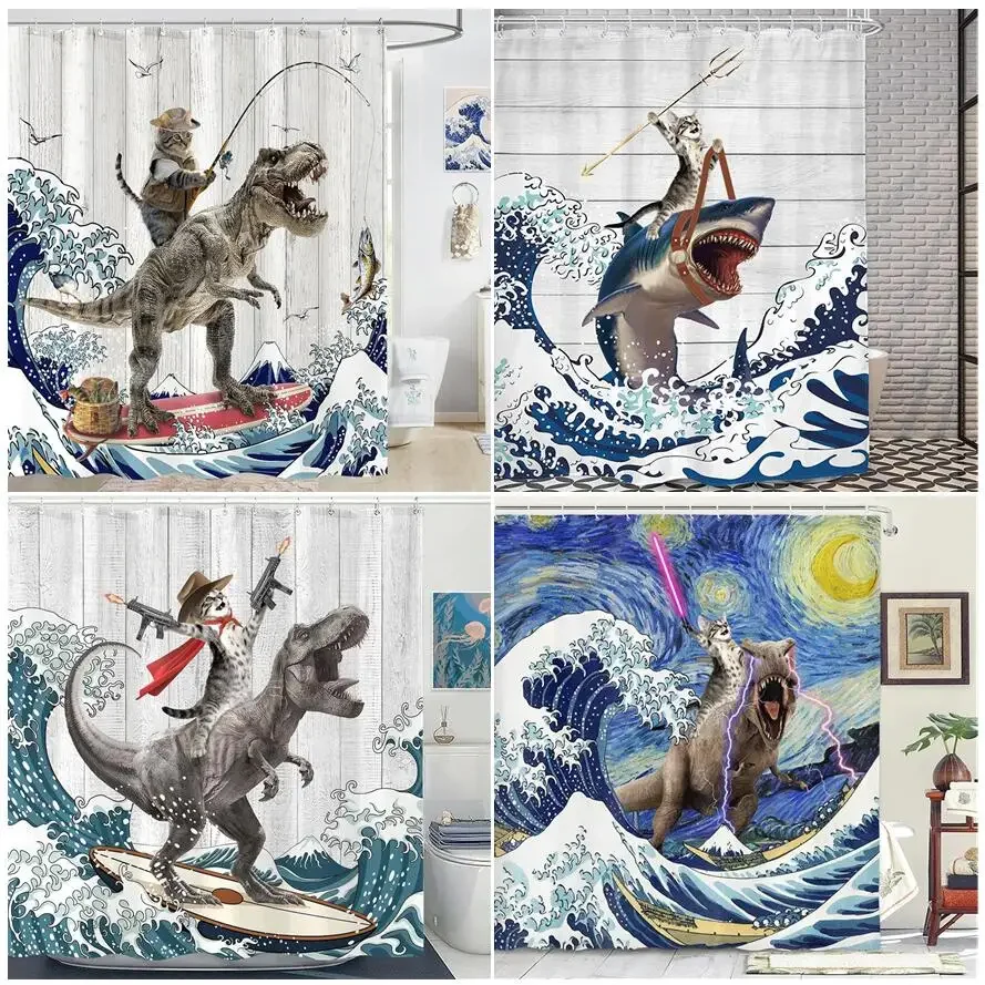 Creative Funny Cat Riding Dinosaur Shower Curtain Ocean Sea Waves Polyester Bathroom Decor With Hook 150x180 4