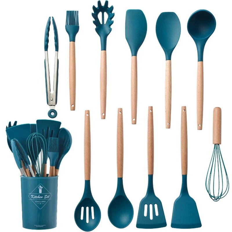 12 Piece Silicone Kitchen Utensils Set With Wooden Handles Non Stick Cookware, Spatula, Egg Beaters, Kitchenware Acces 3