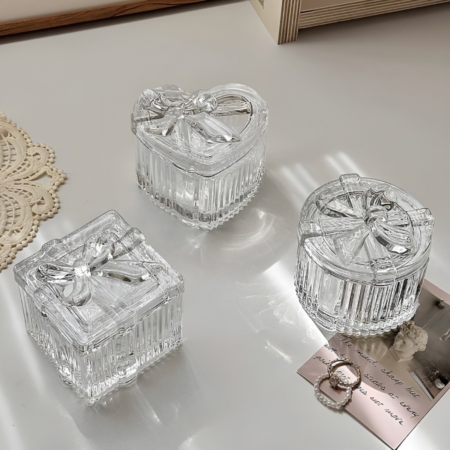 Bowknot Crystal Glass Jewelry Storage Box, Transparent Exquisite Organizer Multifunctional Home Decor For Dressing Table square